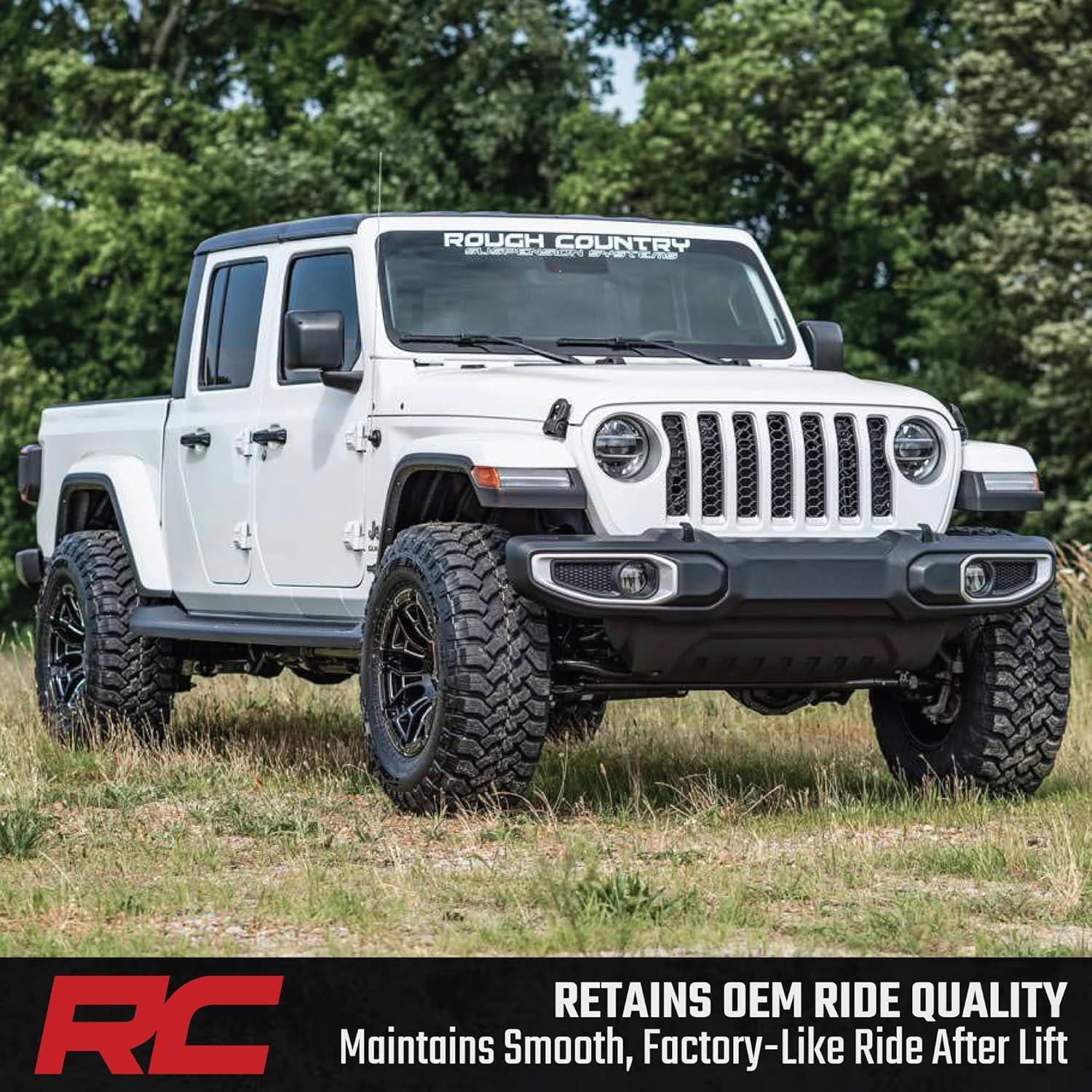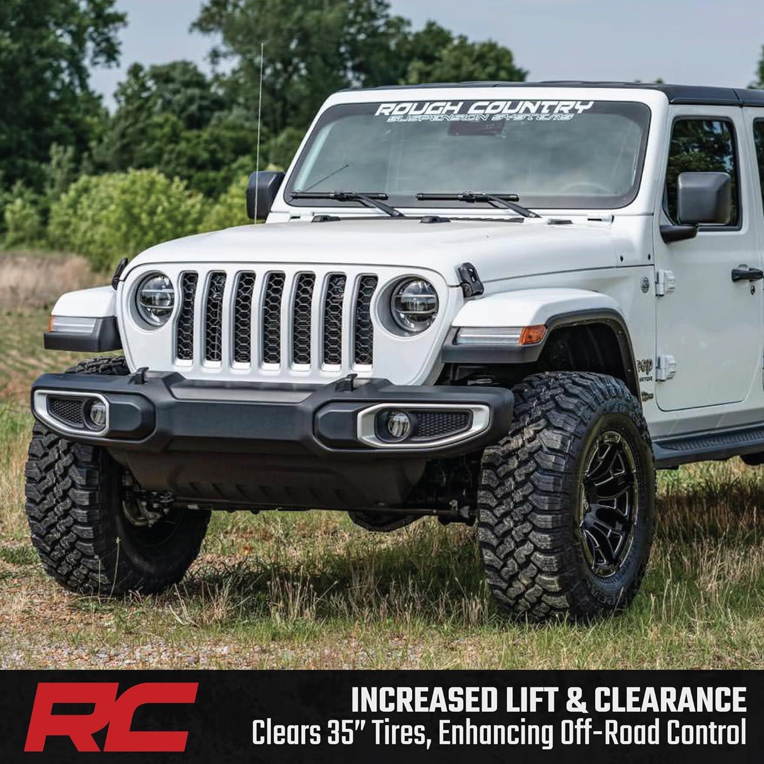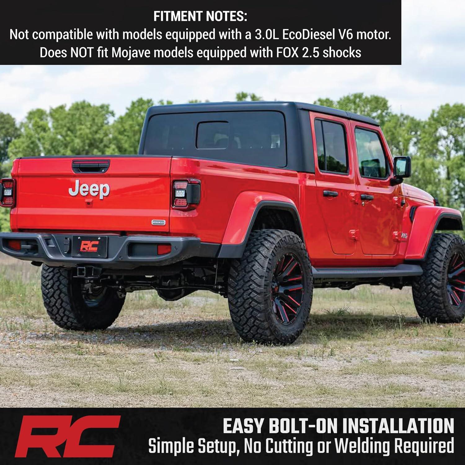 Simple Bolt-On Installation: Enjoy a 100% bolt-on design that requires no cutting or welding, making installation fast and frustration-free. Backed by Rough Country's Lifetime Replacement Warranty, this kit is built for long-term performance and peace of mind. Fitment Notes: Due to variances in motor weight this kit does NOT fit models equipped with a 3.0L EcoDiesel V6 motor. Does NOT fit Mojave models equipped with FOX 2.5 shocks, which use a larger shock bolt incompatible with our replacement shocks. 35″ tires will clear but may rub during extreme articulation. If running 35″ tires on factory wheels, verify clearance between the front tire, lower control arm, and sway-bar links.