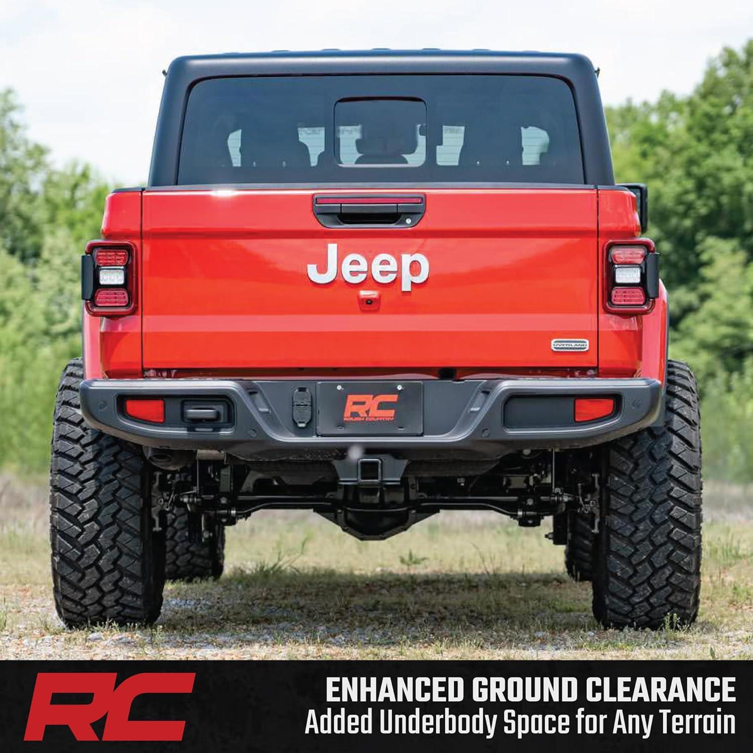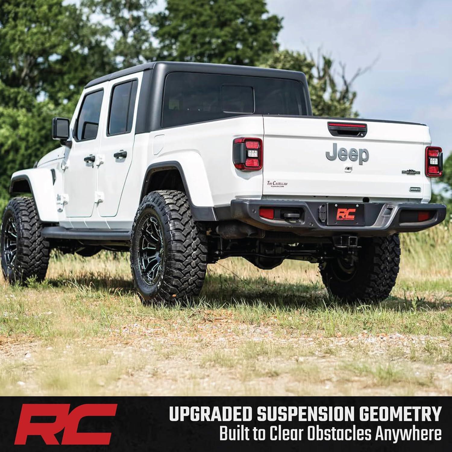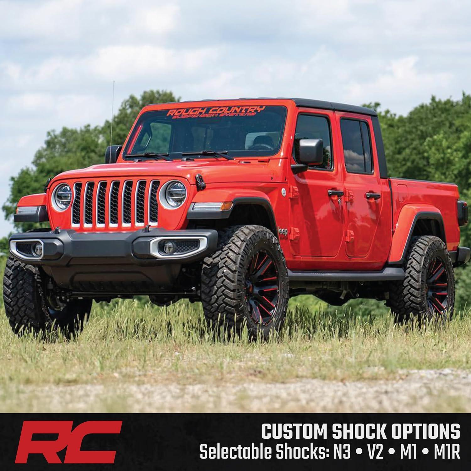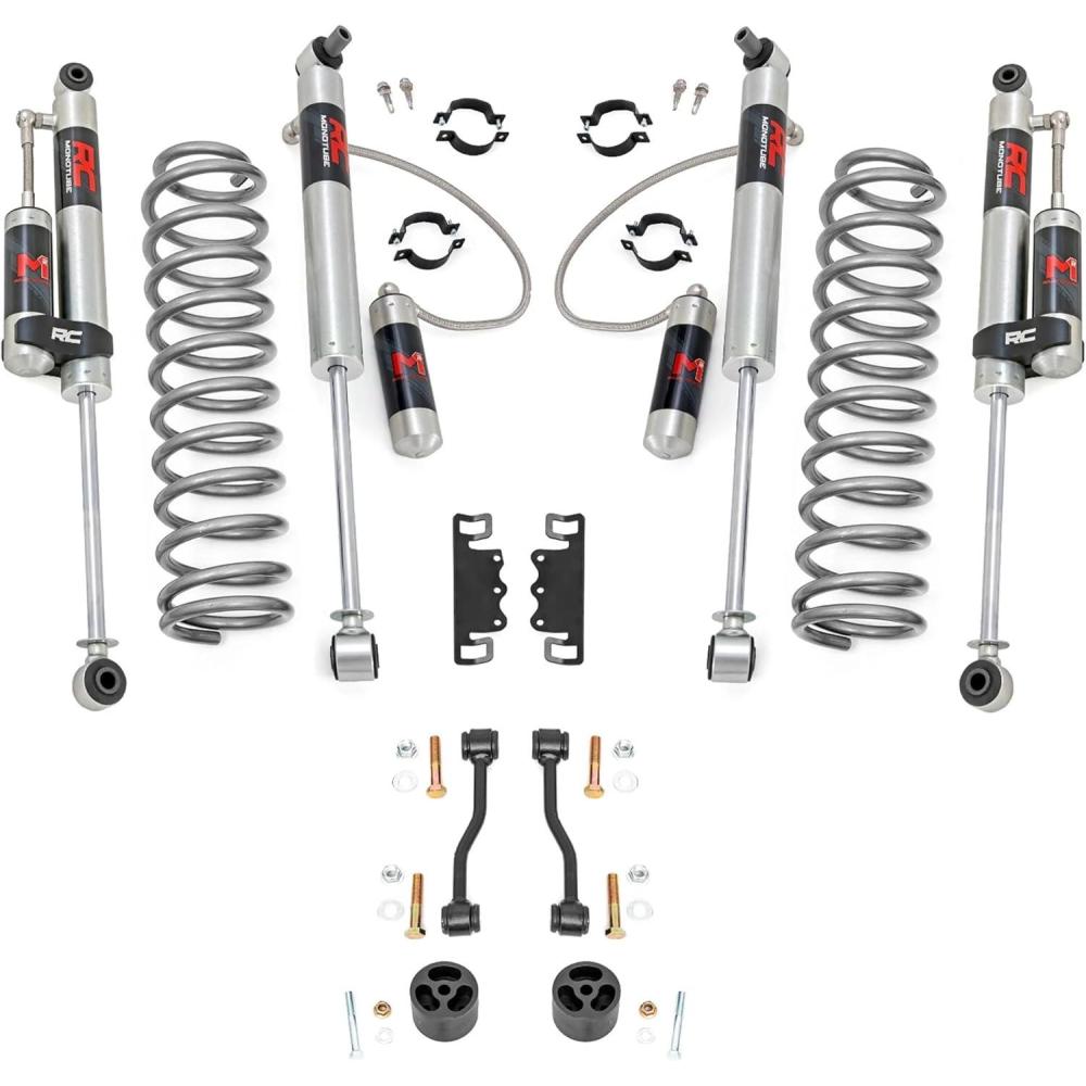 Simple Bolt-On Installation: Enjoy a 100% bolt-on design that requires no cutting or welding, making installation fast and frustration-free. Backed by Rough Country's Lifetime Replacement Warranty, this kit is built for long-term performance and peace of mind. Fitment Notes: Due to variances in motor weight this kit does NOT fit models equipped with a 3.0L EcoDiesel V6 motor. Does NOT fit Mojave models equipped with FOX 2.5 shocks, which use a larger shock bolt incompatible with our replacement shocks. 35″ tires will clear but may rub during extreme articulation. If running 35″ tires on factory wheels, verify clearance between the front tire, lower control arm, and sway-bar links.