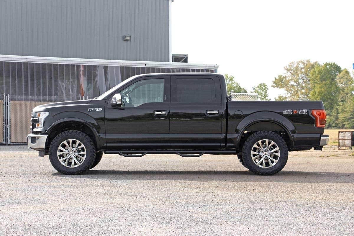 Level your F-150 with Rough Country's new, head-turning Aluminum Leveling Spacer. This easy to install, innovative Aluminum Spacer combines great looks and strength, while providing 2 inches of lift. This new spacer features aircraft quality, T6061 Billet Aluminum offering enhanced durability against elements like rain and rust. Rough Country's new spacer design has a driver and passenger side pattern that allows for clearance between the upper control arm and the strut. This simple design is easy to install with a 100% bolt-on installation process that can be done in mere hours. Best of all, this simple kit levels the front of your truck with the rear, giving your vehicle an overall more aggressive appearance and room for up to 33-inch tires.