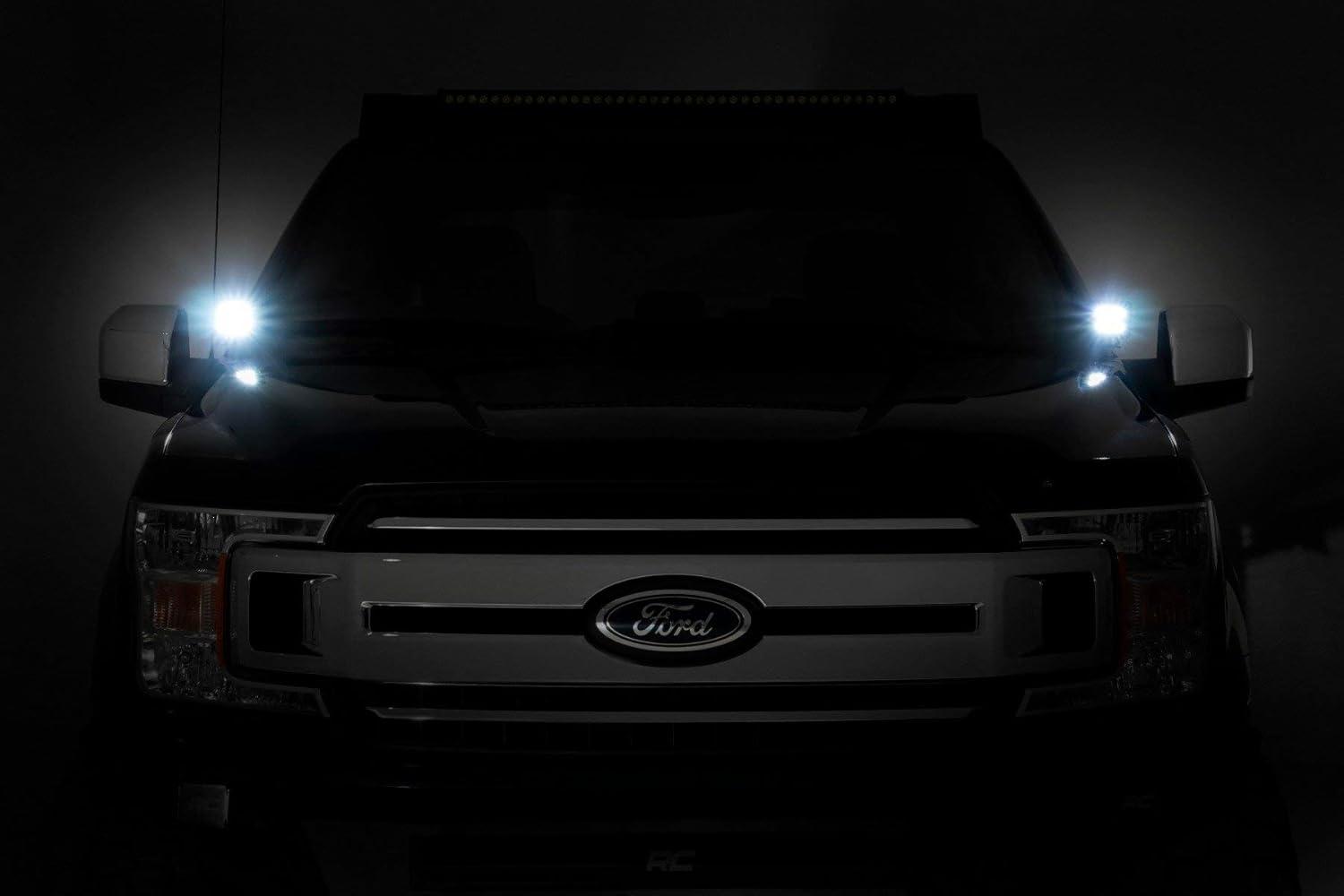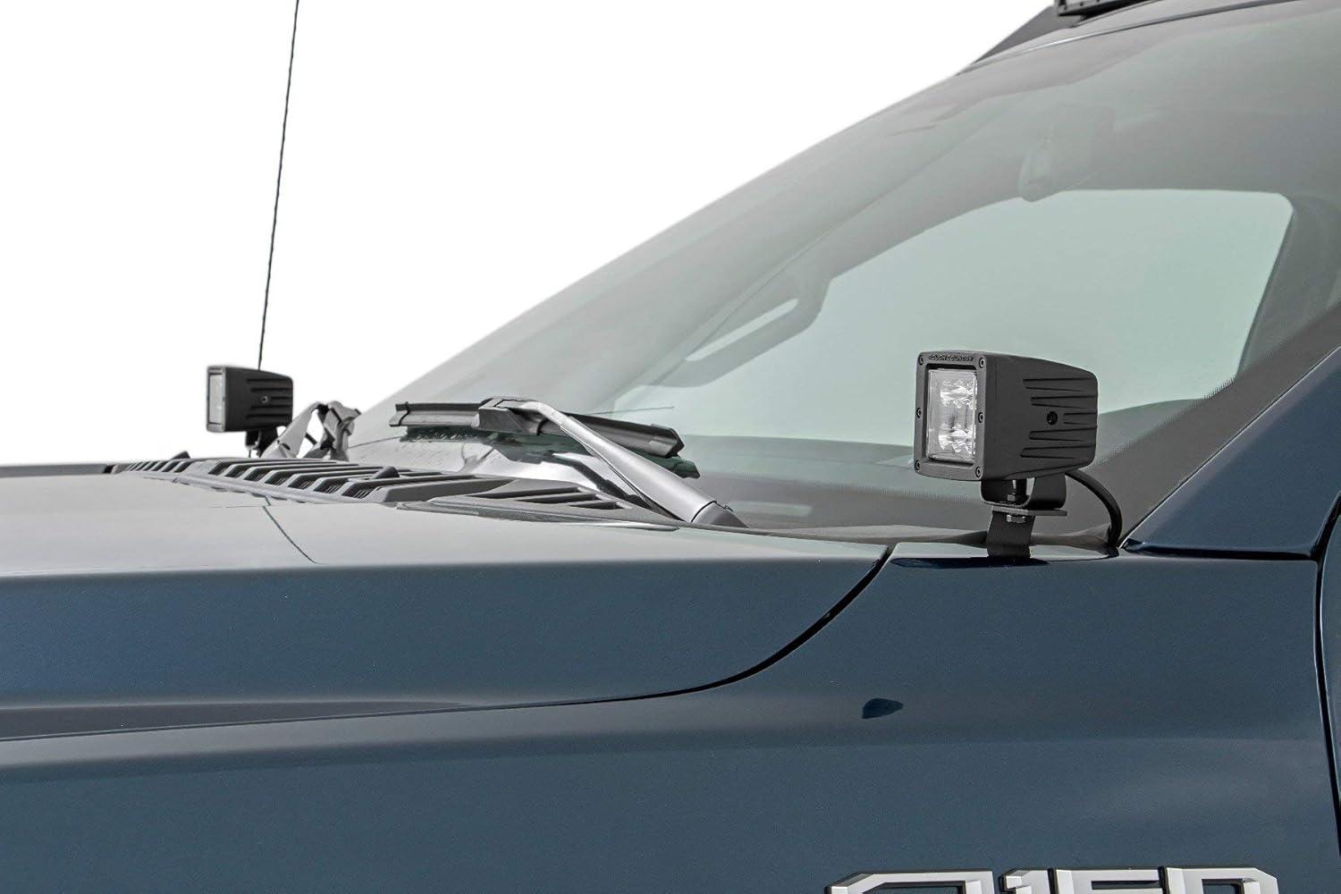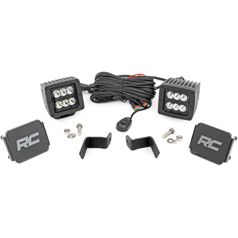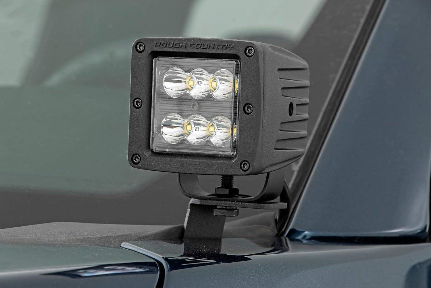 Whether it’s off-road riding at night or navigating the trails after hours, Rough Country’s Quad Cube LED Ditch Mounts gives you the strong side illumination you need. Never miss another turn, and safely maneuver through any off-road situation in the dark without obstructing visibility from inside the cab. This easy to install mounting system is low profile and features 100% bolt-on installation procedure, with no need for cutting or drilling needed. The LED Cubes tuck nicely along the base of the windshield and pack an impressive 2,880 lumens and 36 watts of lighting power. Each Rough Country LED light cube is IP67 Waterproof and includes a premium, braided wiring harness with in-line fuse and on/off switch. This kit Includes Rough Country’s 3-year LED warranty.