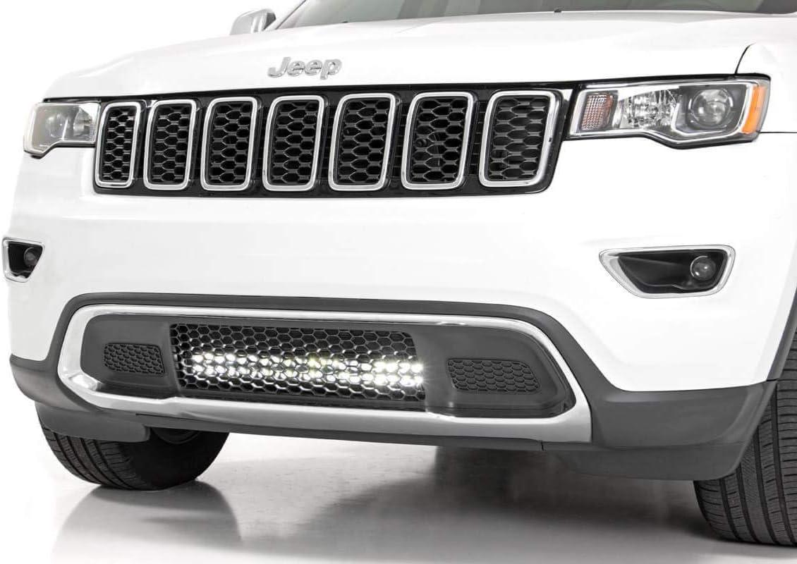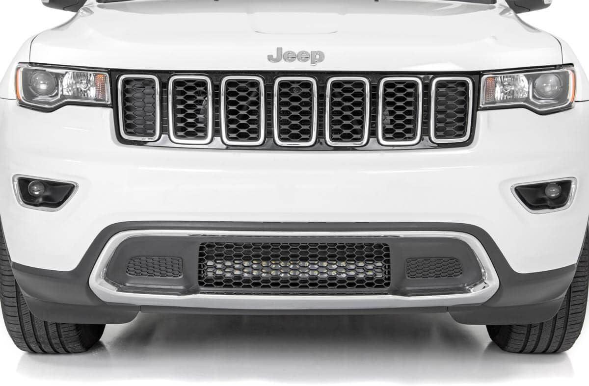 Add LED lighting to your Grand Cherokee quickly and easily with Rough Country's 20in Hidden Bumper LED Kit! This easy-to-install solution lets you mount a 20in Rough Country Dual-Row LED Light Bar just behind the mesh opening in the front bumper. COMMAND THE DARK with this convenient, forward-facing lighting product that makes it easy to see the trail ahead, with powerful LED illumination provided by Rough Country's 20in Dual Row LED Light Bar. Each kit includes your choice of Rough Country's Chrome-Series or Black-Series Light Bars with optional DRL capabilities for the exact look you desire. Best of all, this kit is easy to install – with no cutting or drilling required – making it easy to upgrade the front-end of your WK2 Grand Cherokee with this impressive lighting system. Includes a 3-year warranty!