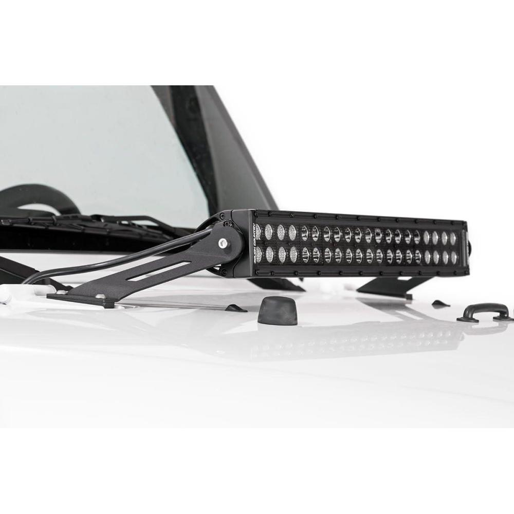 Rough Country's 20″ LED Hood Mount makes it easy to add extra off-road lighting and the aggressive good looks that go with it. Easily attach our 20″ LED Light Bars to your Jeep JK with no cutting or drilling required! This durable, bolt-on light mount attaches to your Jeep's hood using the existing hood hinge mounting point. Includes our Lifetime Replacement .