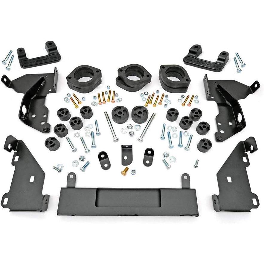 A lift kit for the cost of a leveling kit? Gain enough ride height to run up to 285/75 R17 tires at a fraction of the cost of other kits with Rough Country's 3.25″ Combo Kit for GM 1500's. This unique kit combines our popular 2″ Leveling Spacer and our 1.25″ Body lift, giving your truck a level look with an additional boost for running larger tires. This easy to install kit features a lifetime replacement warranty and is certified FMVSS no. 126 Compliant, proven not to interfere with Electronic Stability Control feature on new model trucks.