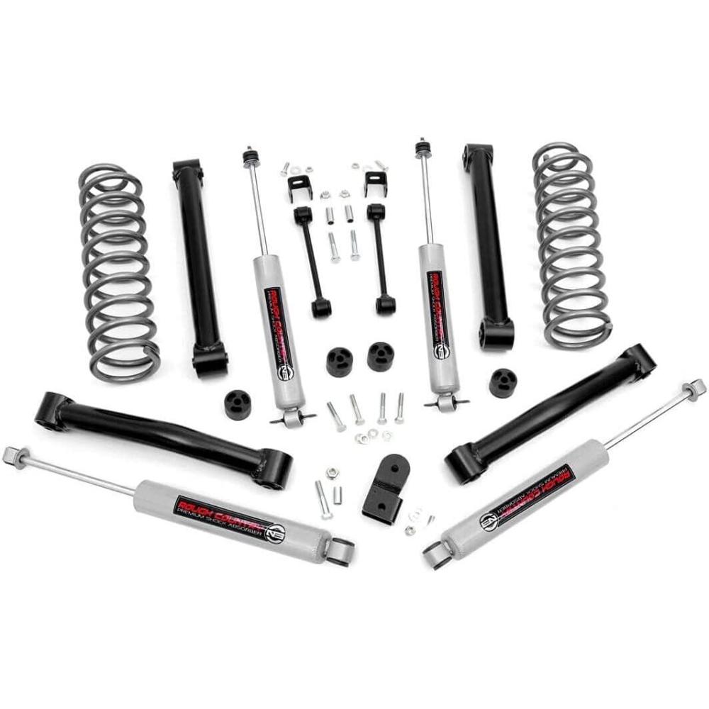 Give your Grand Cherokee ZJ the perfect blend of performance, protection, and style. Unmatched Ground Clearance | Includes Premium N3 Shock Absorbers the best in performance for on and off road use. Maintains Factory Ride Quality. Easy at Home Installation Precision Laser Cut materials used in CAD process. Does not work w/ AWD or V8 models. Includes: FRONT: Lifted coil springs, Fixed lower control arms, Extended sway-bar links, Crossmember spacers, Hardware. REAR: Fixed lower control arms, Track bar bracket, Hardware. SHOCKS: (4) N3 Shocks