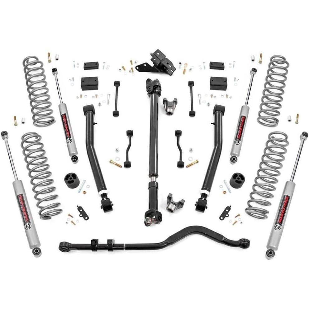 Heavy-Duty Track Bar – Our included track bar is an absolute beast, constructed from forged solid steel for unparalleled strength and durability. With its massive 1.25-inch outside diameter and rugged OEM-style rubber bushings, it's built to handle anything the off-road throws its way. Durable CV Driveshaft – The factory shaft does not have adequate clearance once lifted and will cause damage to the Rzeppa joint if the driveshaft spins while the suspension is fully flexed or articulated. Rough Country's extended Front CV Driveshaft eliminates this issue allowing you to flex your suspension with more peace of mind! Easy Installation: We know you'd rather be off-roading than in the garage all day. That's why our lift kit is designed for easy installation, so you can hit the trails in no time. Fitment Notes: Fits 4-door Non-Rubicon models ONLY. Due to variances in motor weight, this kit does NOT fit models equipped with a 3.0L EcoDiesel V6 motor. Due to variances in coil spring rate this kit NOT fit 392 or 4xe models.