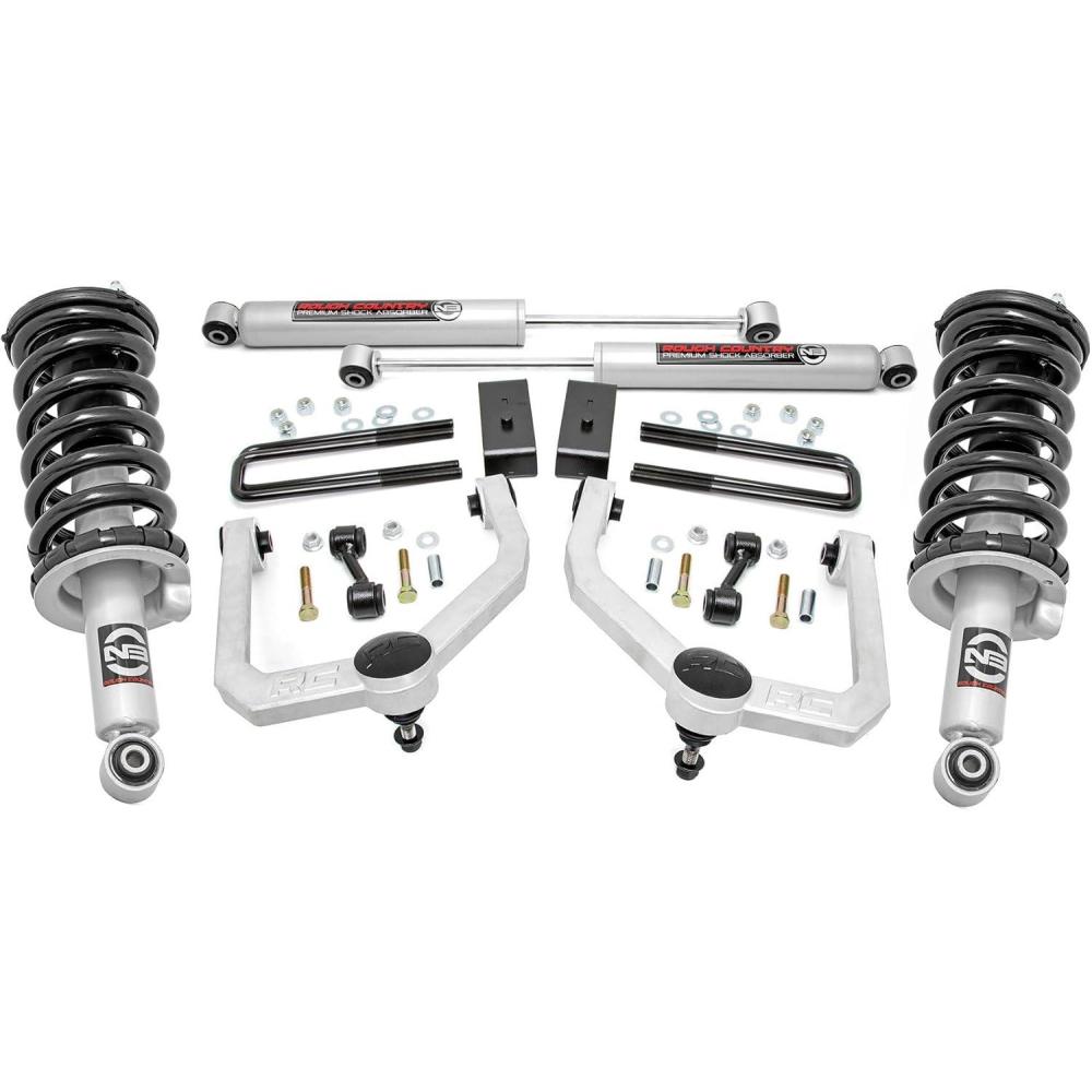 Rough Country's 3in Bolt-On Kit offers easy installation and aggressive good looks at an incredible value. Take your truck to new heights with this excellent option for standard Titan pickups. This kit features a set of high-quality, tubular Upper Control Arms designed to make alignment adjustments easier and Clevite rubber bushings for enhanced durability. These arms are designed to promote a factory-like geometry by keeping the ball joint at optimum angles after lifting. This design allows for an improved, greater range of motion from the ball-joint, with less stress, wear and tear. Also included are a set of durable strut spacers and fabricated rear blocks to provide lift height from front to rear. Once installed, this kit gives your truck plenty of ride height for up to 33in tires while offering a clean, level look from front to rear. Rough Country's N3 Performance Struts/Shocks. Our Nitrogen charged, lifted struts/shocks add ride height to your truck while maintaining a smooth, factory-like ride. This all-inclusive kit comes with everything you need, and installation is a piece of cake compared to other kits on the market! Featuring a 100% bolt-on installation process that requires zero cutting or drilling, this kit can be installed using common tools in a home garage, and allows the truck to be returned to stock at any time if so desired. Best of all this kit features Rough Countrys Lifetime Replacement Warranty.