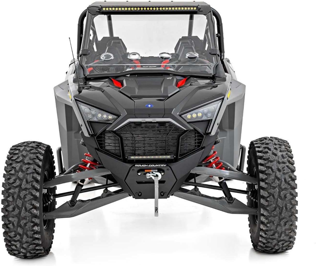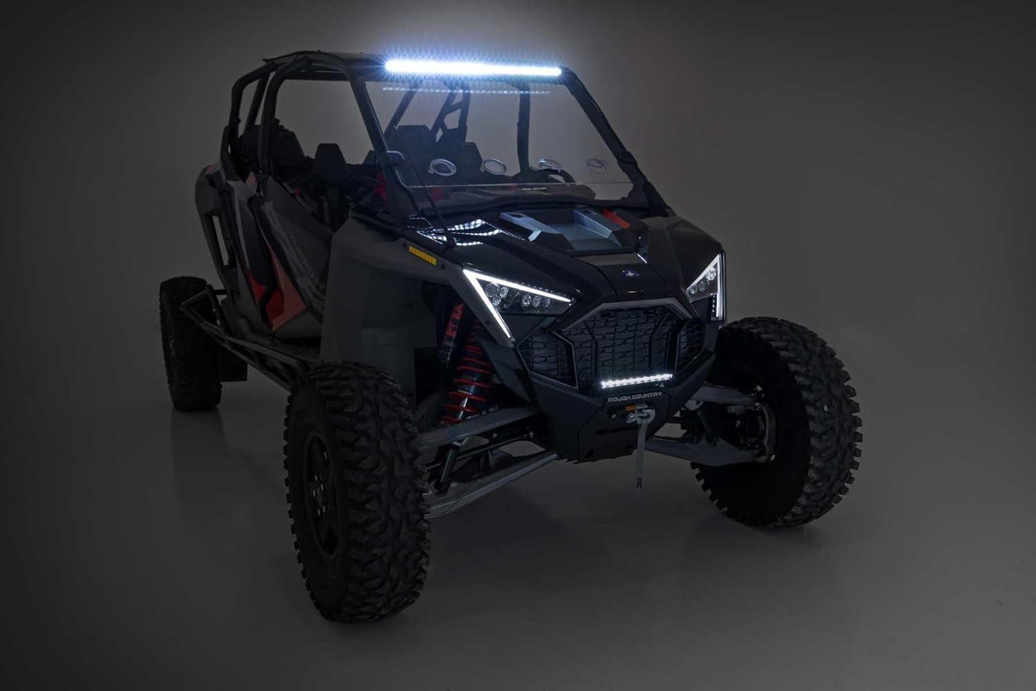 Light Up the Night. Rough Country's 30-inch LED Upper Windshield Kit for your Polaris RZR Turbo R gives you all the performance and durability that Rough Country is known for and provides plenty of light coverage for use on the trail or work site. This handy solution includes everything you need to upgrade your Polaris UTV with a 30-inch LED light bar in the perfect, forward-facing position for off-road illumination.