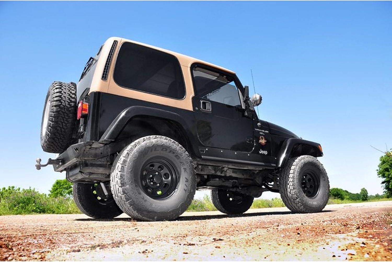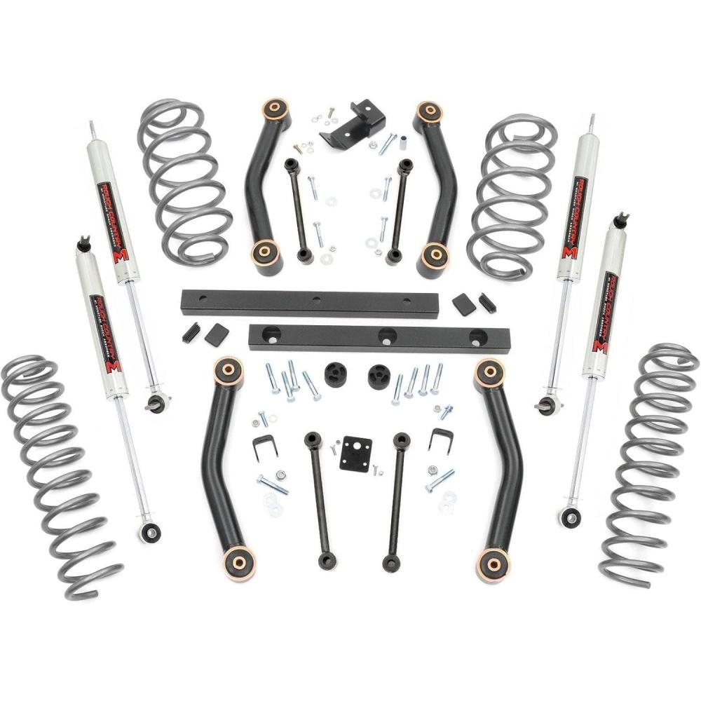 Who says your daily driver and your weekend warrior can't be the same vehicle? The 4″ M1-Series Kit for Jeep TJ was engineered by Rough Country's Research and Development Team to give the perfect blend of off-road performance and smooth highway ride. A set of application tuned, lifted coil springs are included in this kit along with a set of tubular lower control arms outfitted with rubber Clevite bushings for the best in vibration dampening. The 4″ M1-Series kit also includes a tubular transfer case drop kit, track bar bracket; and a full set of extended sway bar links. Improve your on and off-road ride quality with Rough Country's premium M1 shocks!