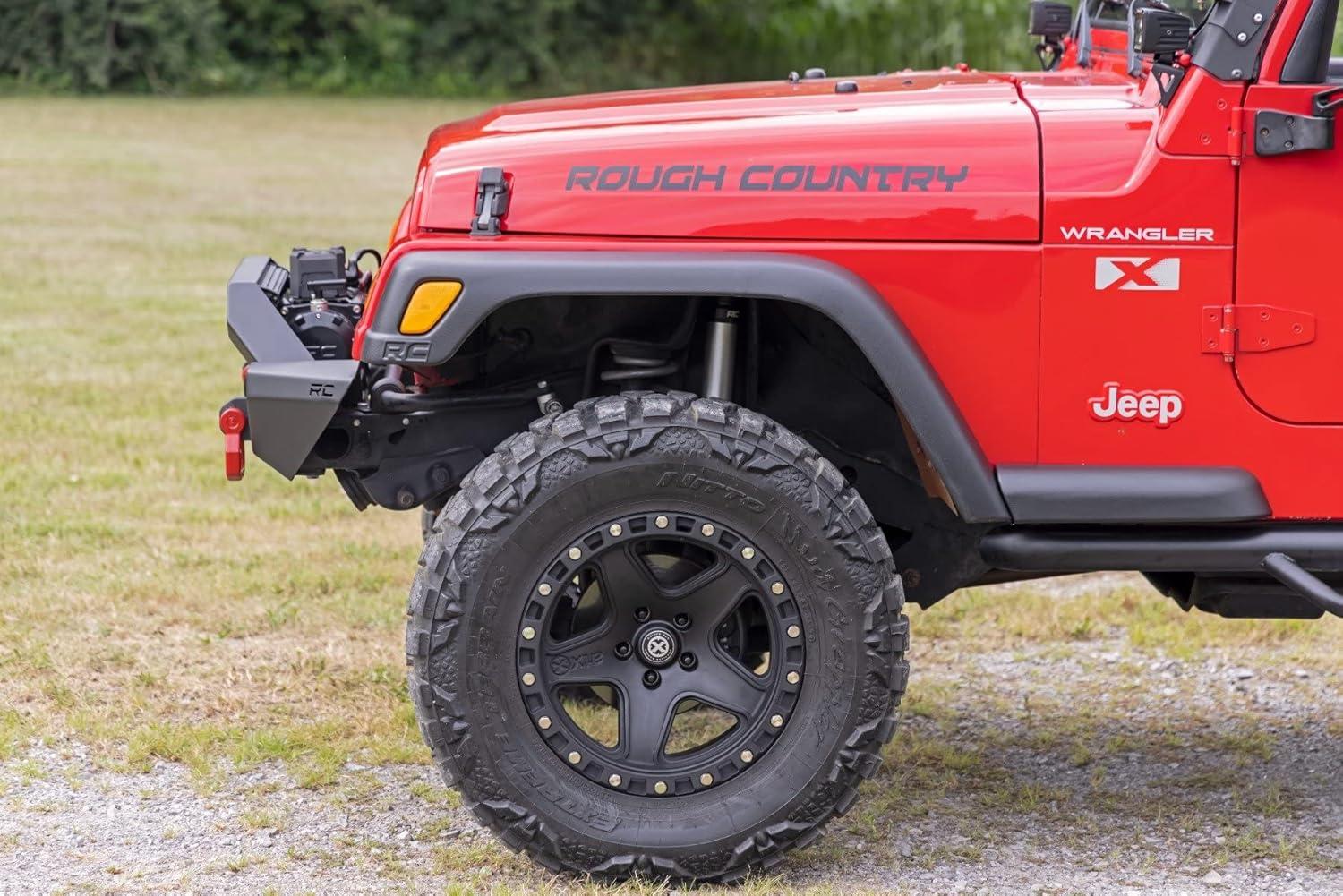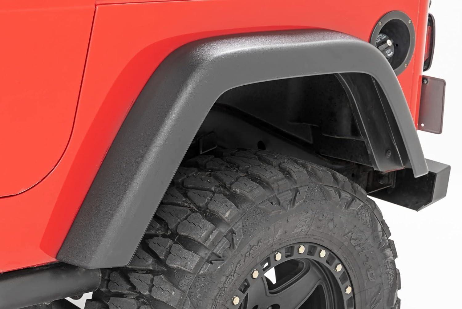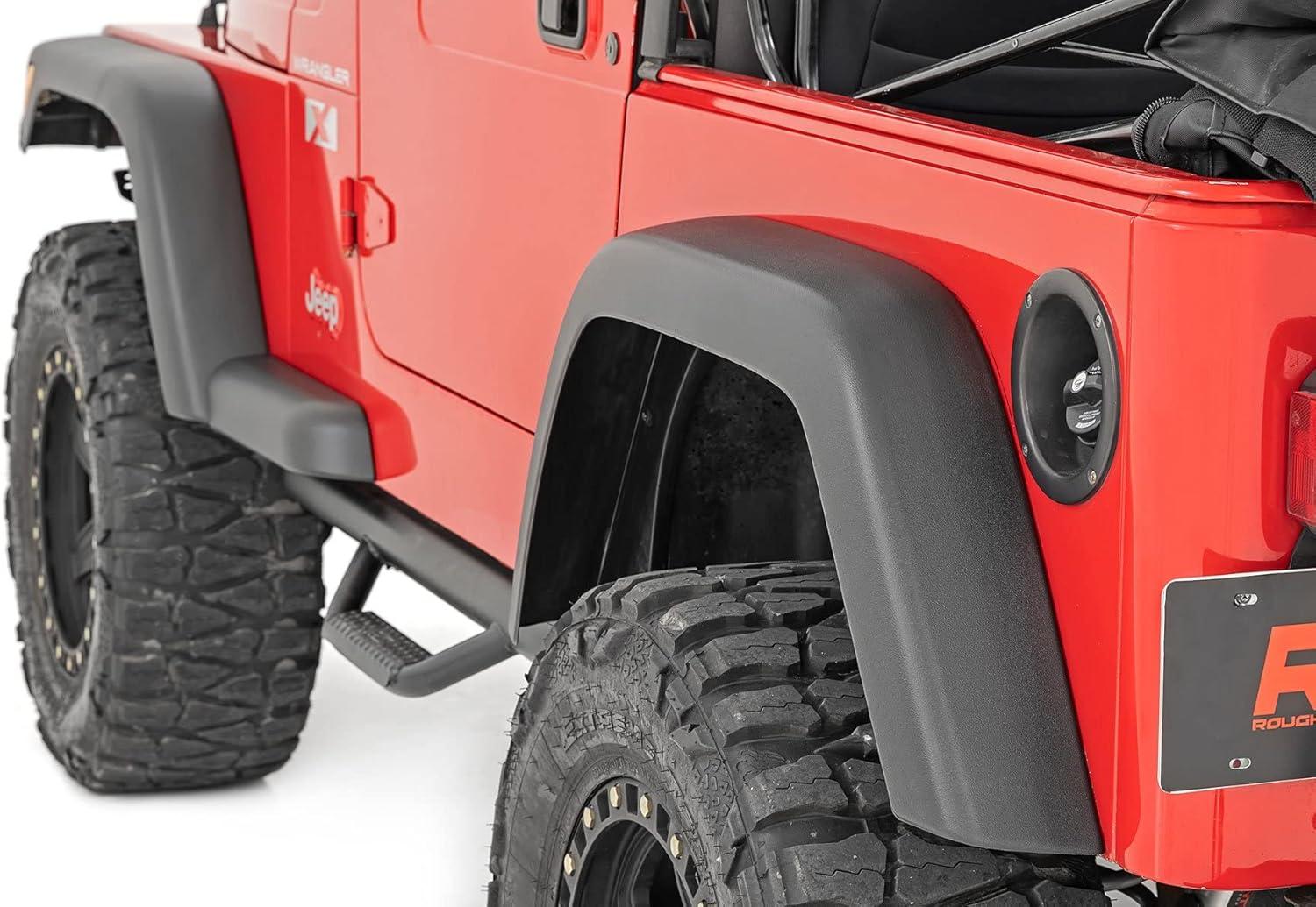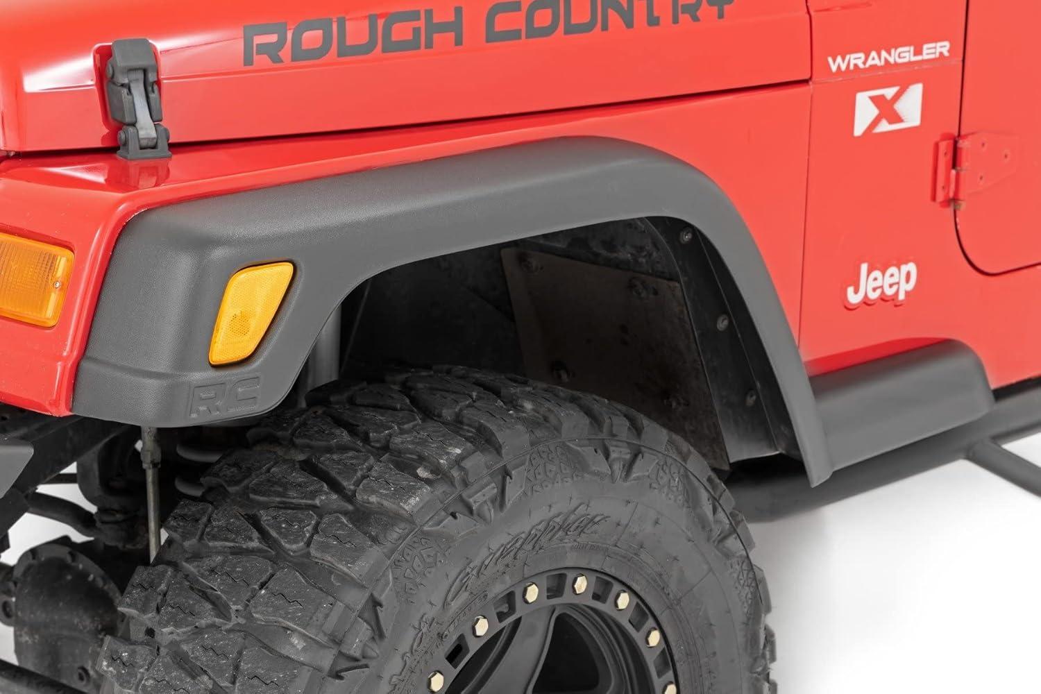 Innovative Design and Added Protection. Increase your Wrangler's protective features while adding impressive good looks with Rough Country's 5.5″ Wide Fender Flares. These aggressively good-looking flares transform your TJ's exterior boasting a wide coverage area ensuring to protect your Jeep's body from mud or road debris kicked up by the tires.