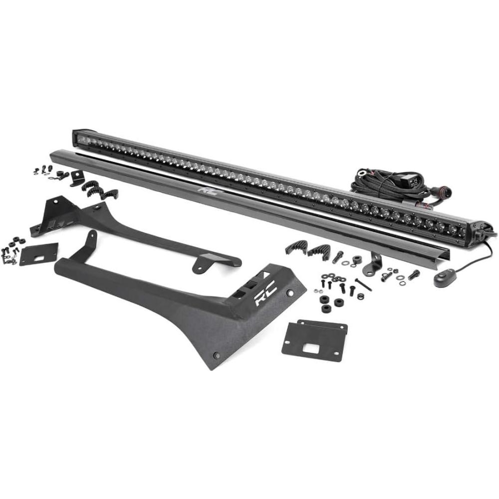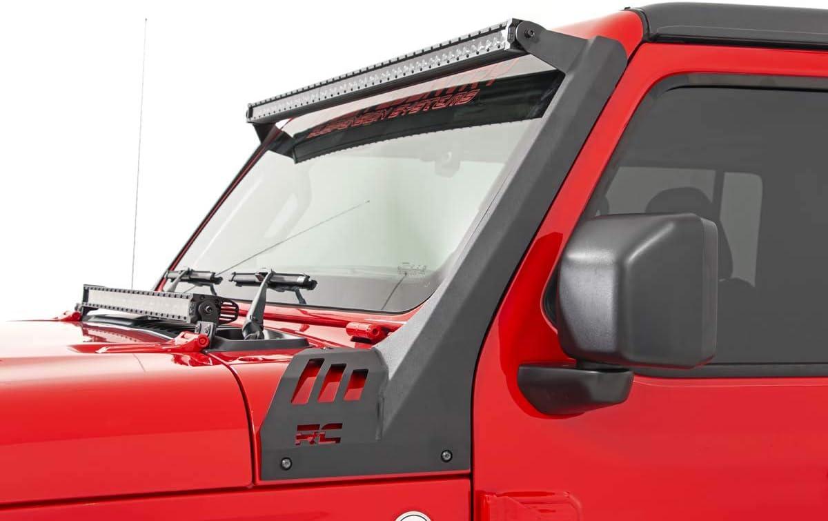 COMMAND THE DARK with Rough Country’s 50-inch LED Upper Windshield Light Bar Kit. This easy-to-install kit is the ultimate solution for adding an aggressive looking, forward-facing lighting system to your Jeep! With its modern, stylistic design and superior strength, this upper windshield mount holds your 50-inch Light Bar between the top of your Wrangler's windshield and roof, spanning the entire width of the roof and giving a killer look.