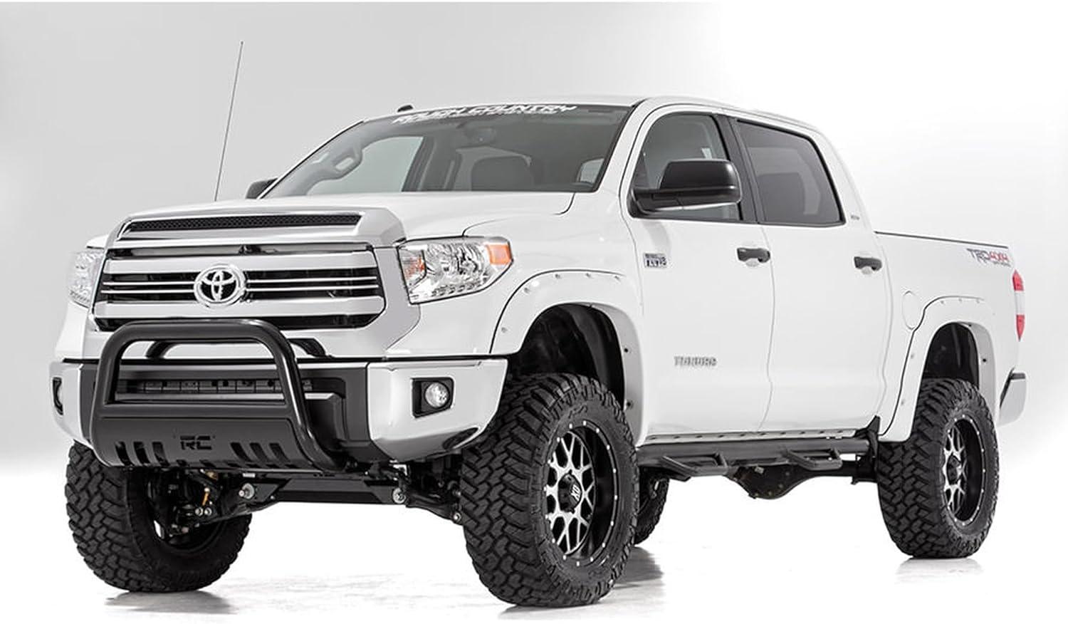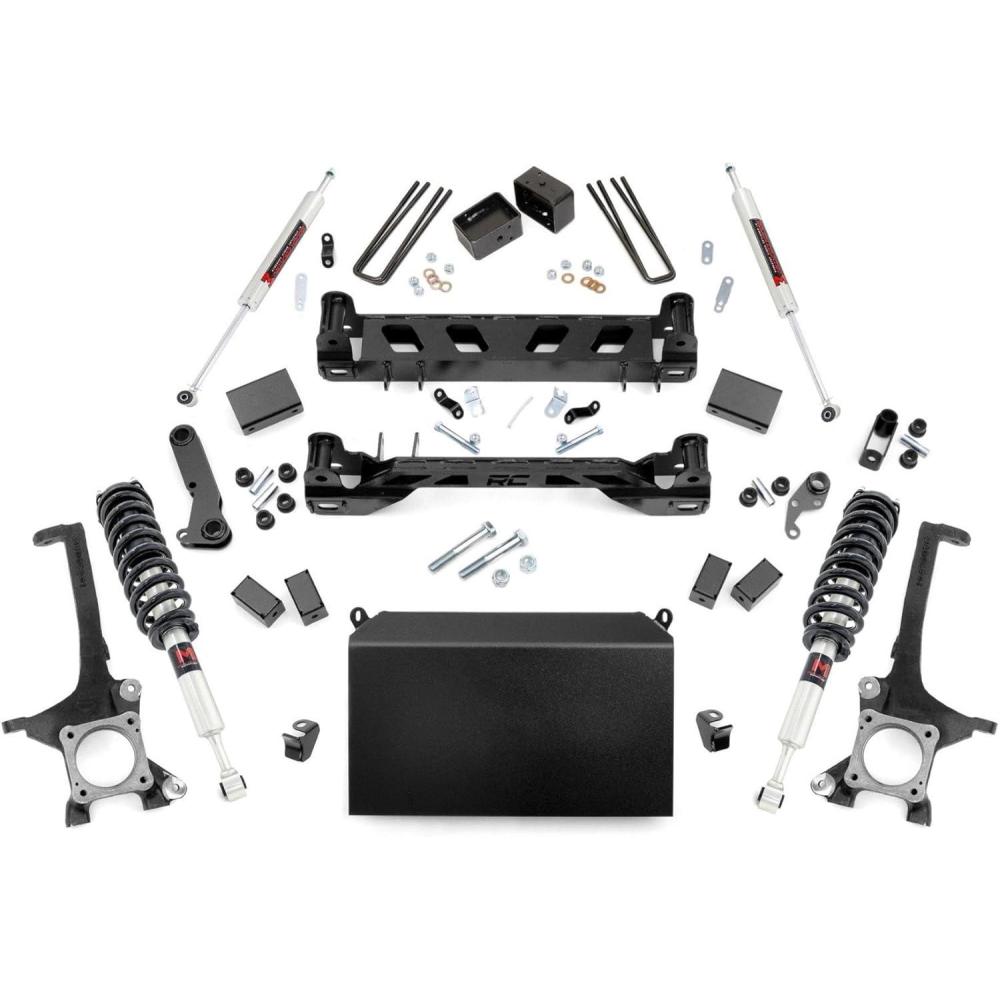 You'll never look at a Tundra the same way after installing Rough Country's 6″ Tundra kit. This all-inclusive kit is a total transformation for your truck, with durable lifted knuckles, protective skid plate, and all the brackets and hardware needed to set your truck to a factory-like geometry while providing additional ground clearance. The beefy front crossmember features a high-clearance design to help traverse off-road obstacles with no hang-ups. Run larger wheels and tires while giving your truck a one-of-a-kind look and exceptional off-road performance. This kit affords your truck an aggressive appearance and a higher profile that is sure to demand attention. This kit includes Rough Country's Nitrogen-charged M1 Shocks for the ultimate balance in highway ride quality and off-road vibration dampening. Includes Rough Country's Lifetime Replacement Guarantee.