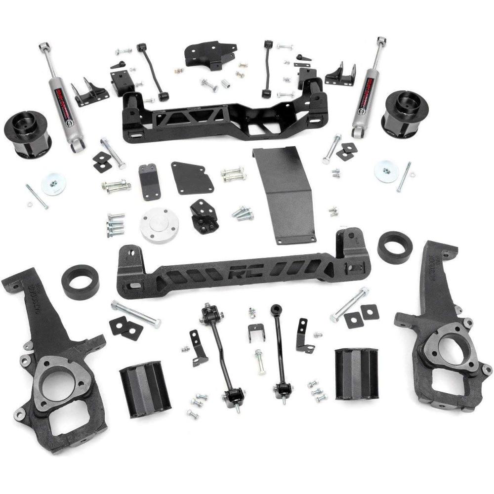 Give your RAM 1500 the perfect blend of performance, protection, and style with Rough Country's 6″ Suspension Lift. Designed to offer an affordable way to maximize off-road performance and run up to 37″ tires, these kits offer high quality, heavy-duty equipment for new model Ram 1500 s. Utilizing heavy-duty, laser cut, steel equipment engineered by Rough Country, these 6″ Suspension Lifts are complete kits that include everything needed for outstanding off-road performance. High-clearance front and rear cross-members provide enough room for off-road climbs and runs. A heavy-duty skid plate shields the vehicles differential, protecting you from hazardous terrain. A durable set of driver and passenger side lifted cast knuckles are also included, helping to promote proper geometry once the vehicle is lifted. Best of all? You'll achieve better performance, bigger tires, and considerable protection all without sacrificing the look of your truck. All components are specifically designed to keep things nice and tidy underneath, utilizing drop brackets to promote proper geometry and leaving nothing hanging out in plain sight. The beefy cross members feature a laser-cut RC logo, giving the truck a fierce, but streamlined look after lifting. Includes Rough Country's Lifetime Replacement Guarantee!