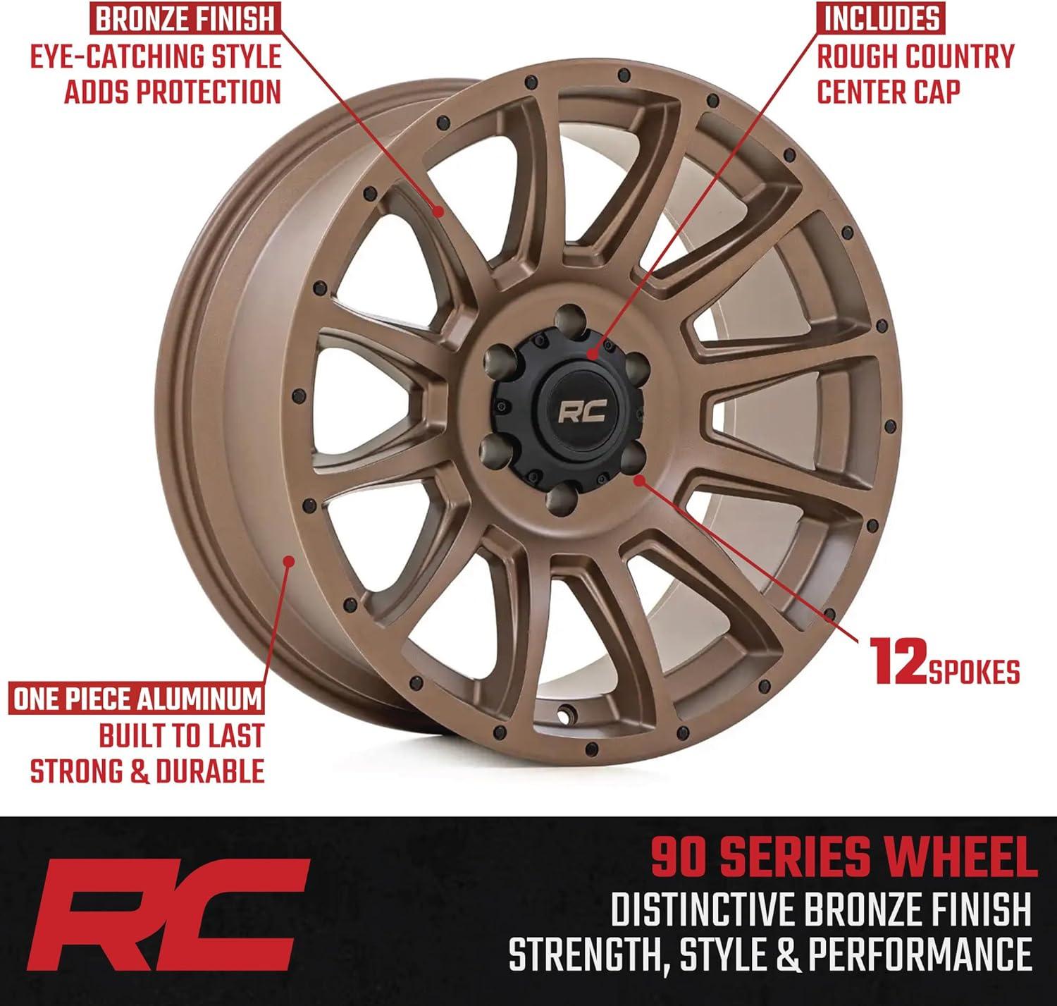 Rough Country 90 Series One Piece Aluminum Wheel – 20 x 9 in, 6 x 5.5″ Bolt Pattern, -12 mm Offset, Bronze Finish with Black Accent Bolts(18×9 inch)