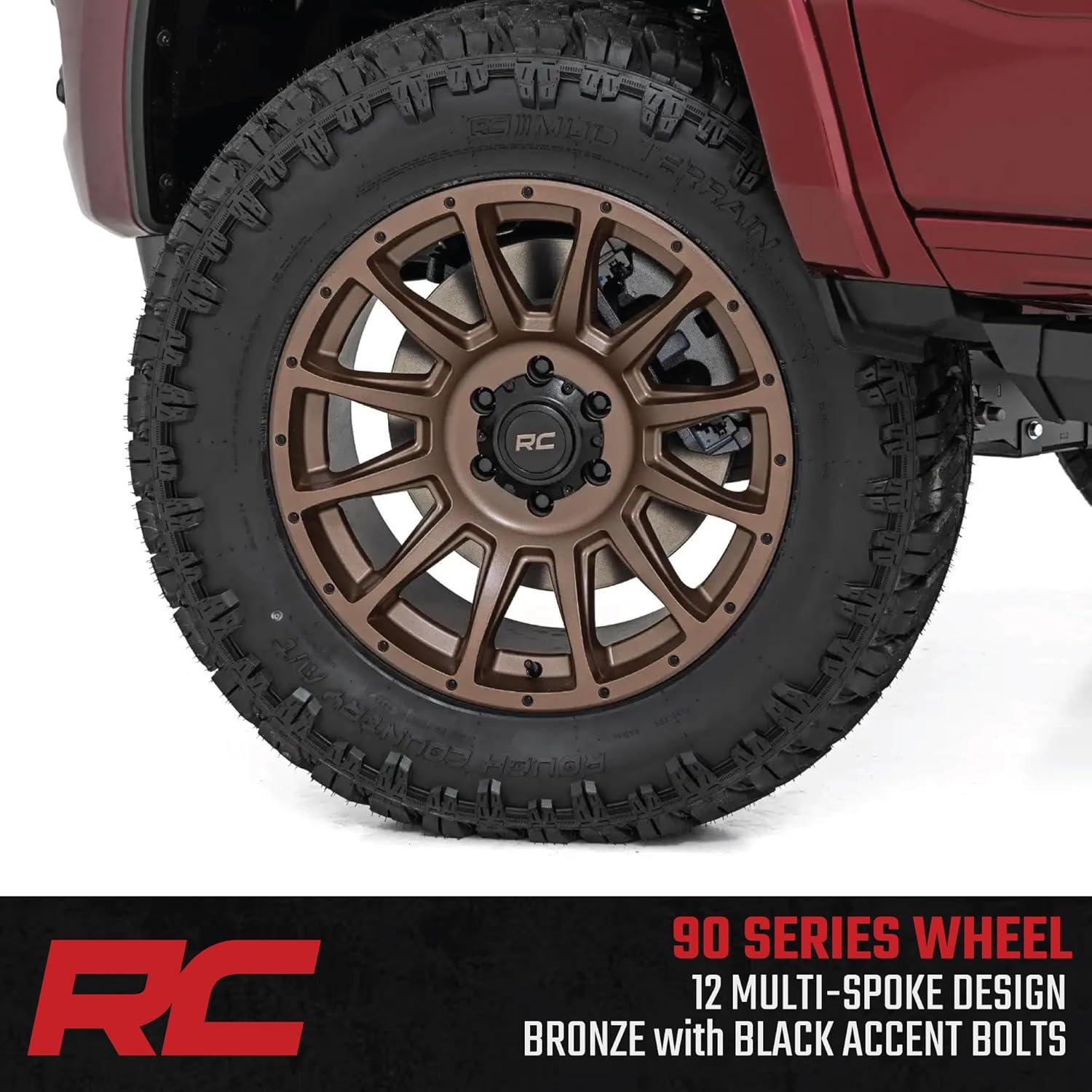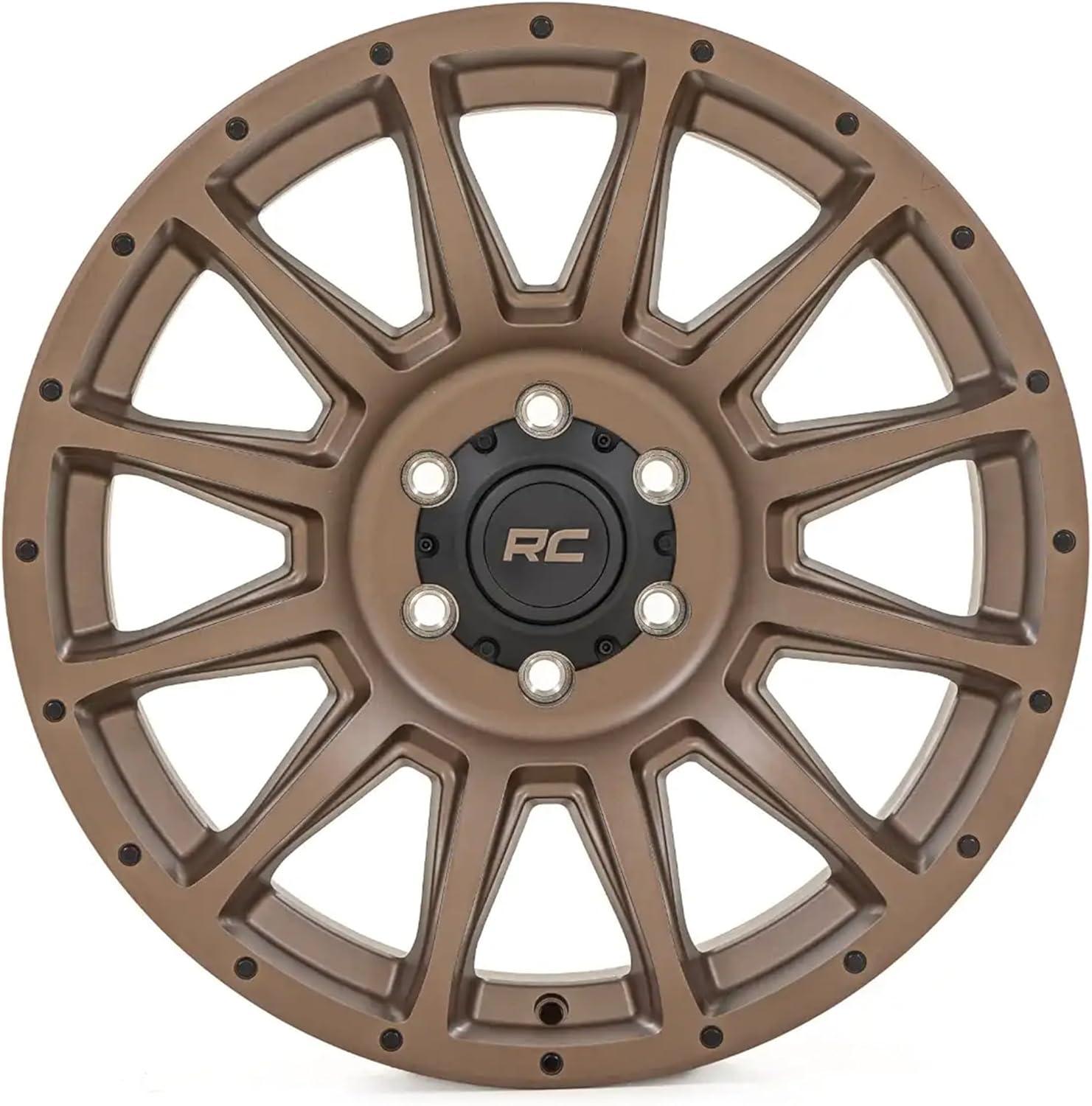 Rough Country 90 Series One Piece Aluminum Wheel – 20 x 9 in, 6 x 5.5″ Bolt Pattern, -12 mm Offset, Bronze Finish with Black Accent Bolts(18×9 (+0 mm Offset))