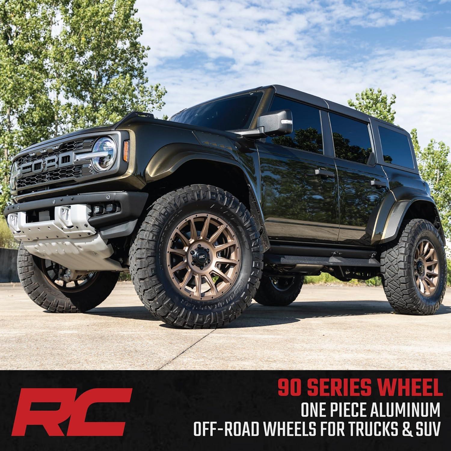 Be the first to review “Rough Country 90 Series One Piece Aluminum Wheel – 20 x 9 in, 6 x 5.5″ Bolt Pattern, -12 mm Offset, Bronze Finish with Black Accent Bolts(18×9 inch)”