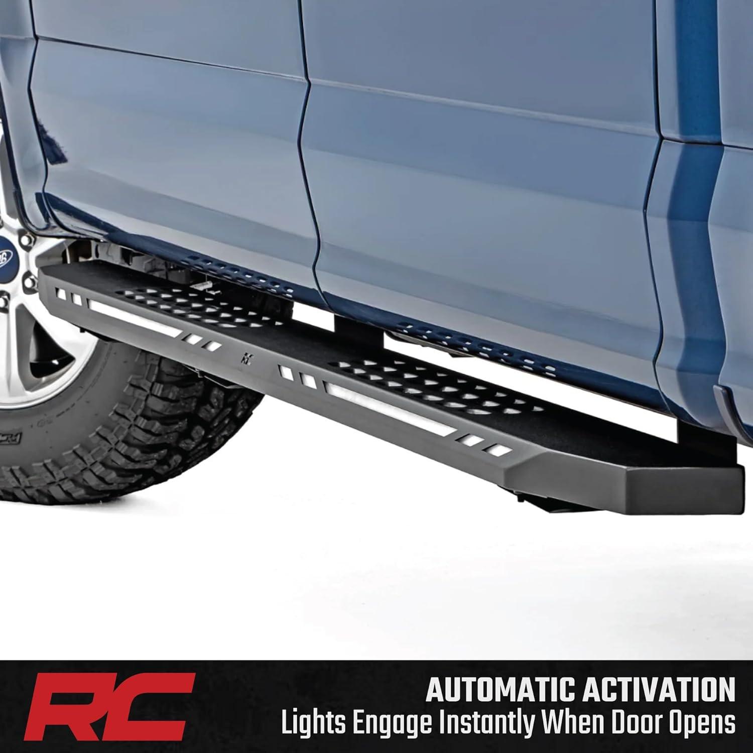 Rough Country AC2 Running Boards for Ford F-150/Lightning/F-250/F-350/Raptor (2015-2025) Crew Cab - Bolt-On Aluminum Side Steps with Auto-On Amber/White LED Lights