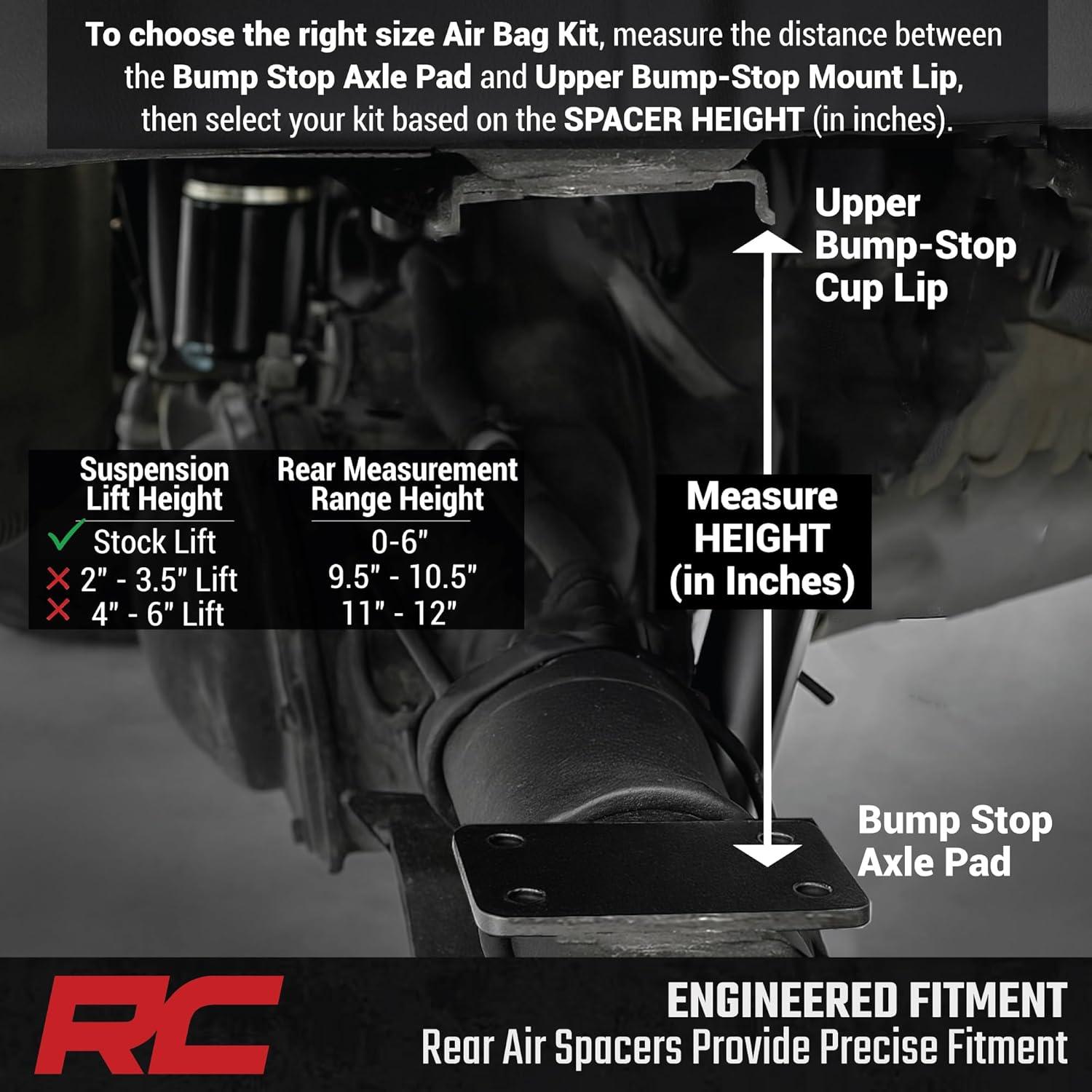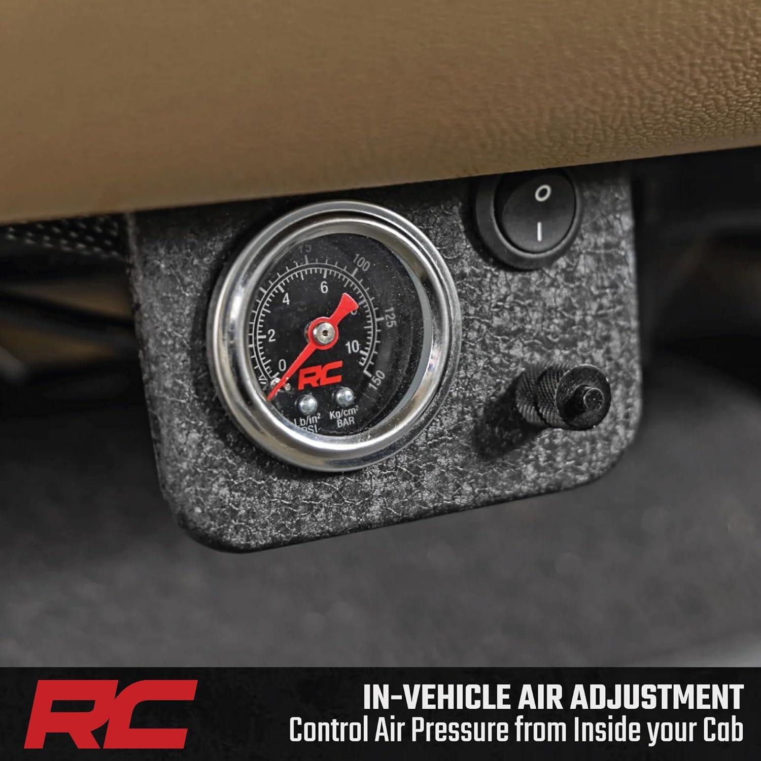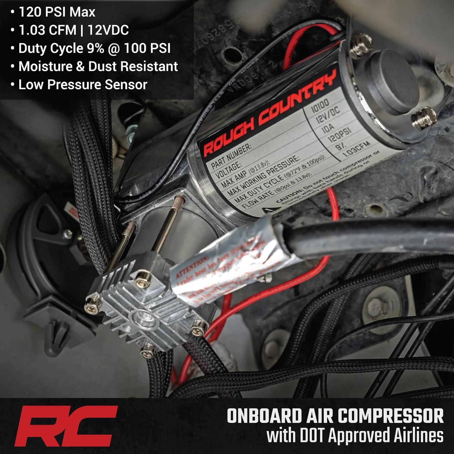 Upgrade with Onboard Control (Optional): Add Rough Country’s wireless air compressor system to adjust your air pressure on the fly. Fits models with 4-6″ lift, supports up to 5000 LBS of load.
