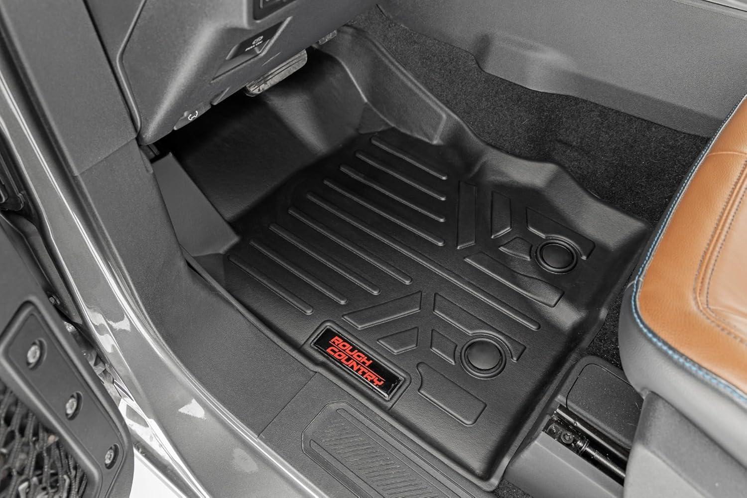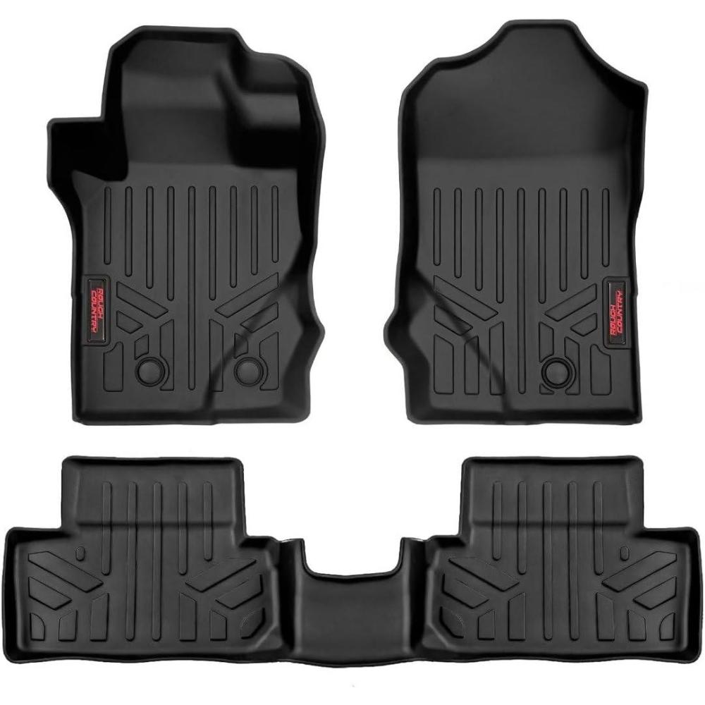 Keep your carpet in pristine condition with Rough Country's Floor Armor: Heavy Duty Floor Mats and Rear Cargo Liners. These eco-friendly, semi-flexible floor mats are made of an ultra-durable Polyethylene that offers a strong, rigid shape that's incredibly easy to clean. Where simple rubber floor mats fail, Rough Country's line of Floor Armor is guaranteed for life and will never crack, split, or break-down over time. The high-quality design extends the lifespan of your carpets and the raised-lip design insures your interior will always be protected from mud, moisture, and more. These contoured floor mats are laser-measured for each make and model; designed to be a precise fit that grips the carpet and stays put. An aggressive looking textured surface gives your muddy shoes plenty of traction and looks great inside the vehicle. No matter what you track in, Rough Country Floor Armor is incredibly easy to clean. Just pop them out of the floorboards and rinse away the dirt! Includes Rough Country's Lifetime Replacement Warranty. Note: Fits 2-Door Models only, does not fit Vinyl Flooring.