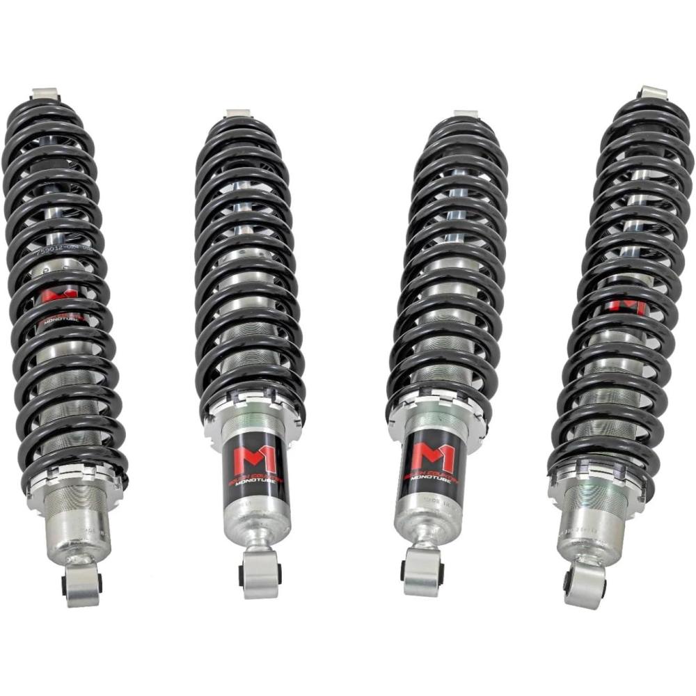 Quality Construction. Rough Country's M1 Coilovers have been engineered to give you the most reliable performance, increased driving comfort, and all-around performance for your UTV. Made from 2″ seamless extruded tubing and feature durable vulcanized natural rubber bushings. They're also zinc plated for resistance against the elements. Plus, they're adjustable in height. Utilizing multiple grooves in the shock body the spring perch can be raised or lowered to achieve additional height or simply function as a stock height replacement. So whether you're looking to add a little extra clearance for off-roading or just want your ride to sit a little higher, our M1 Coilovers are the perfect solution.