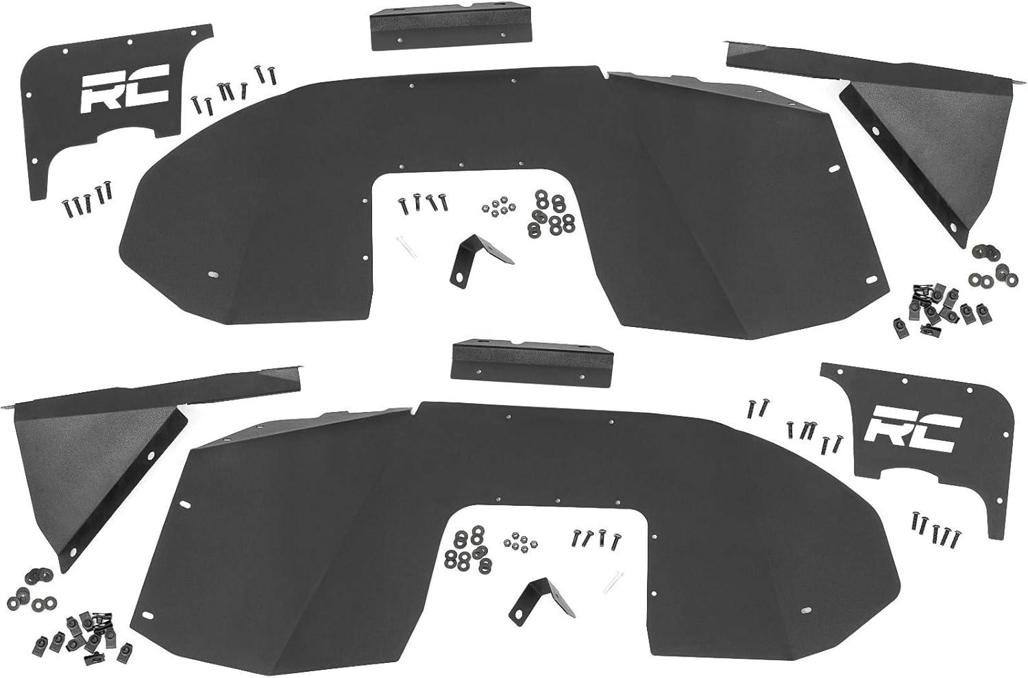 Clean up the look of your inner fenders with Rough Country's JL Front Inner Fender Liners. This eye-catching inner fender upgrade helps protect your engine bay from dust, mud, and debris, and can be easily installed in no-time flat! Aftermarket fenders are a huge improvement for most Jeeps wanting to get the best clearance and articulation possible, but when removing the stock fenders many people also remove the stock fender liners. Regain protection in this crucial area and protect your engine bay from the elements with Rough Country's innovative Front Inner Fender Liners. With a unique 3-piece construction, these liners cover more areas than other liners on the market, giving more protection to your engine bay and body panels. Each Rough Country liner features a corrosion-resistant powder coat for long-lasting durability. Additionally, these liners mount firmly to the body for quiet operation, free of rattling or vibration noise. The solid-steel, angular design with RC logo cutout gives an aggressive look to this now more visible area on your JL. An included, removable logo plate can be custom painted to any color you wish for a pop of extra color. Rough Country Inner Fender Liners feature a bolt-on installation process with minor drilling for an easy upgrade you can do with common tools in a home garage. Includes Rough Country's Lifetime Replacement Warranty.