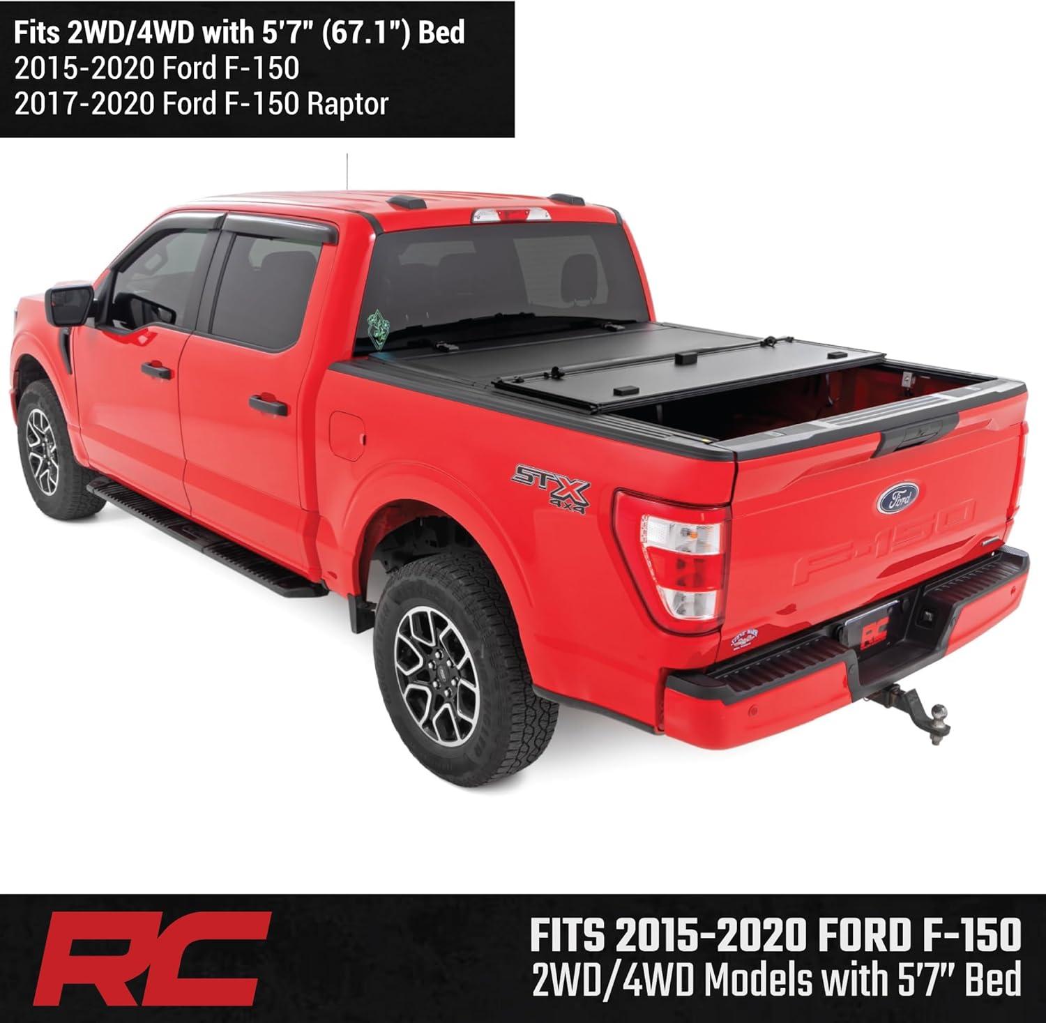 Rough Country Hard Tri-Fold Tonneau Cover for Ford F-150 (2015-2020) – Low-Profile Aluminum Truck Bed Cover, Fits 5’7 Bed (67.1″)