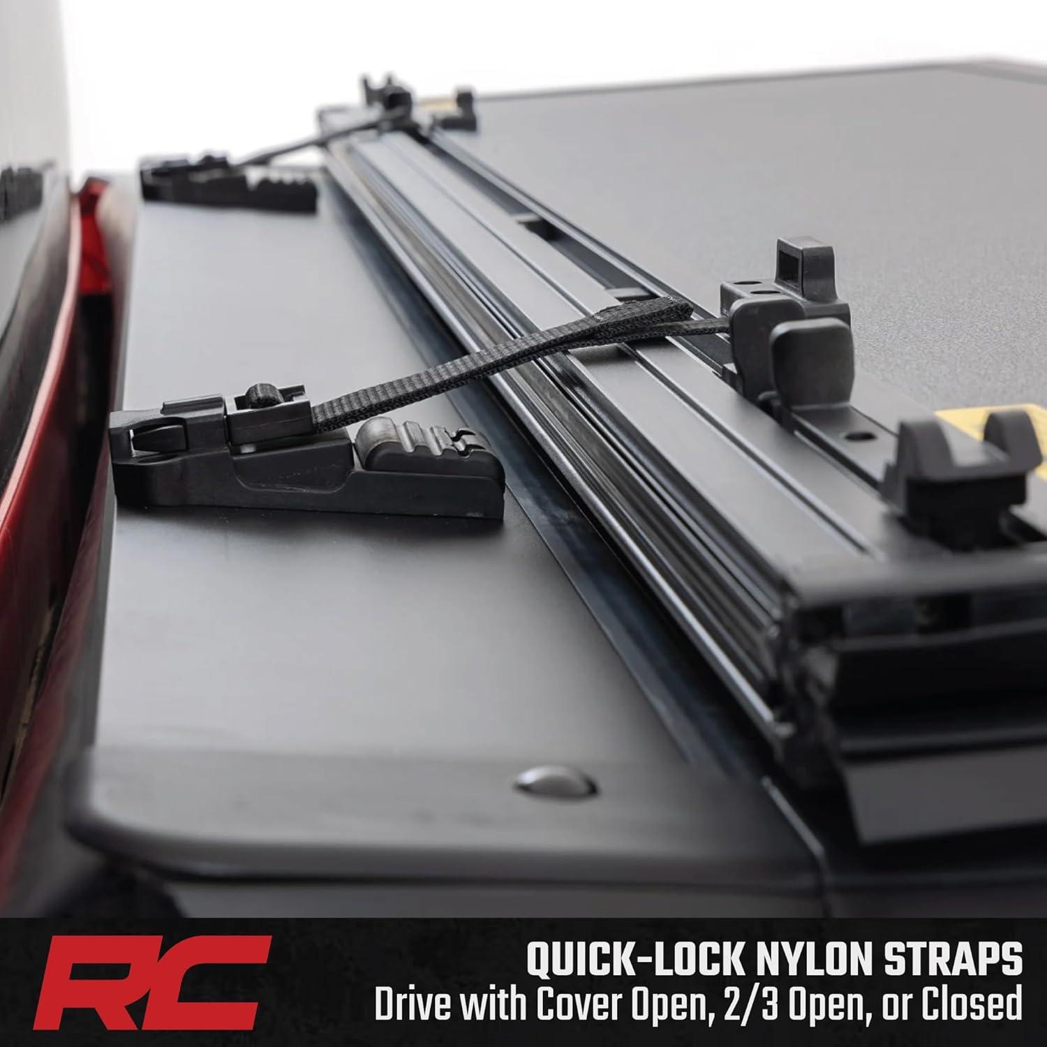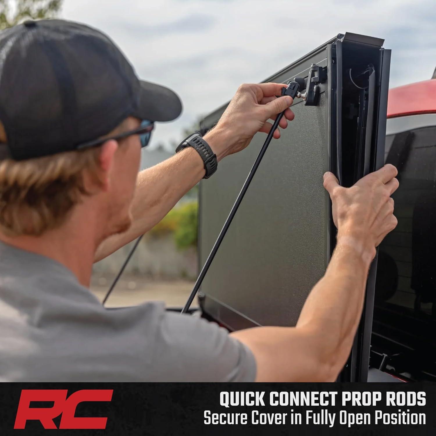 Easy Cargo Access: Quick-connect prop rods hold the cover fully open; nylon straps secure it at 2/3 open. Drive with the cover fully open, 2/3 open, or closed.