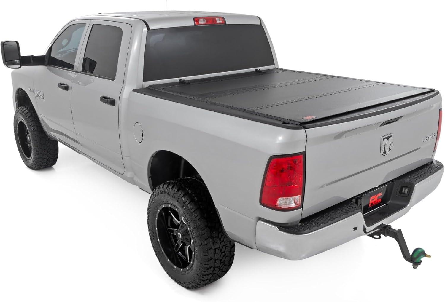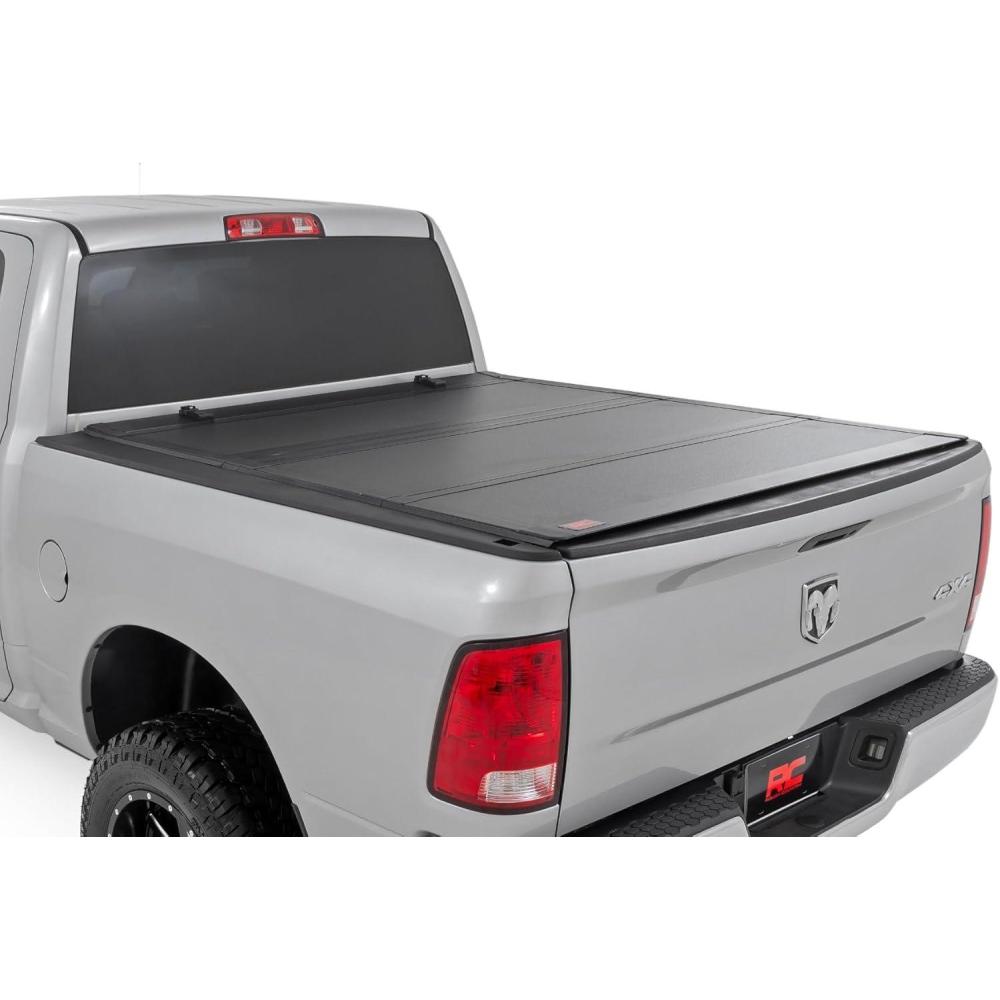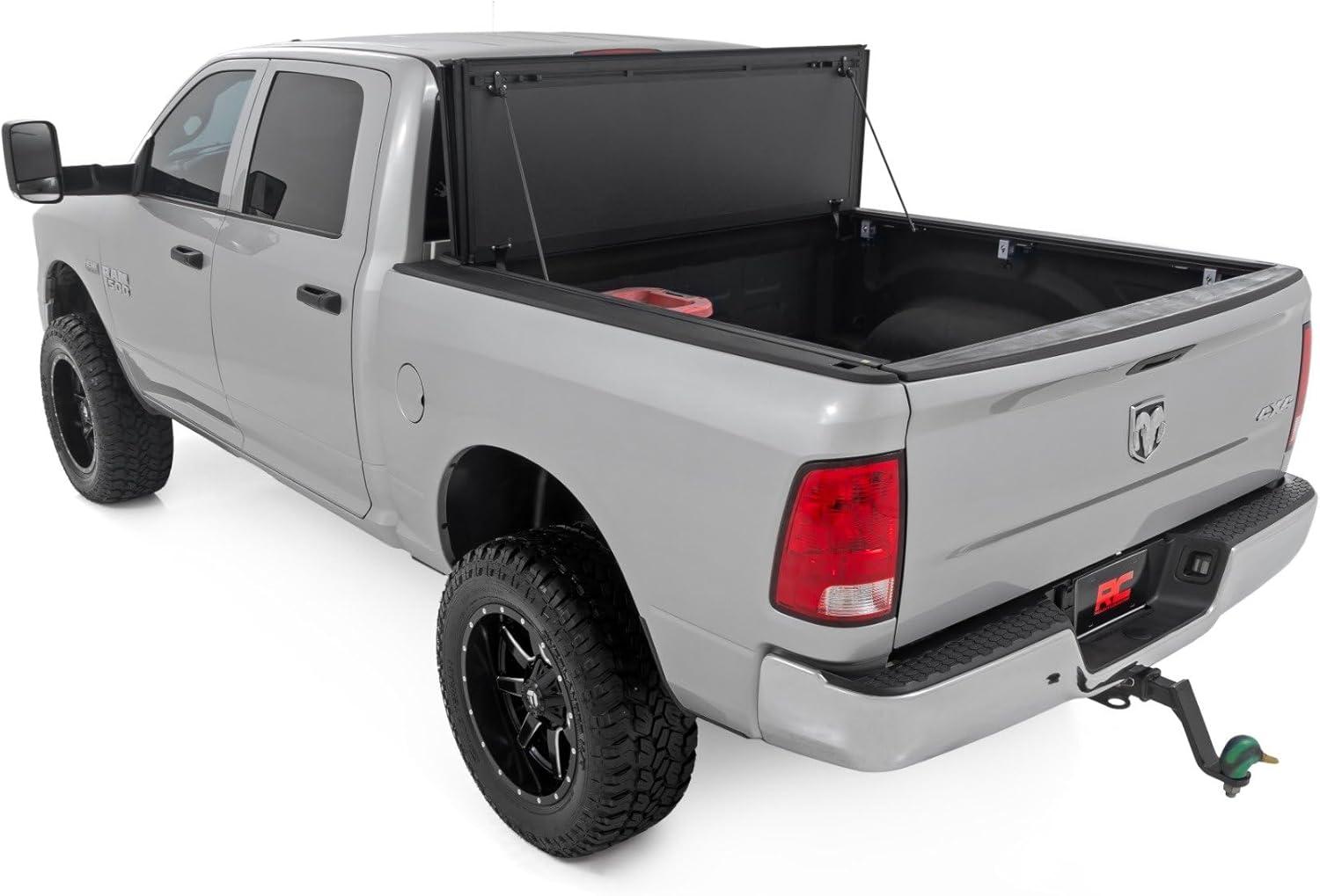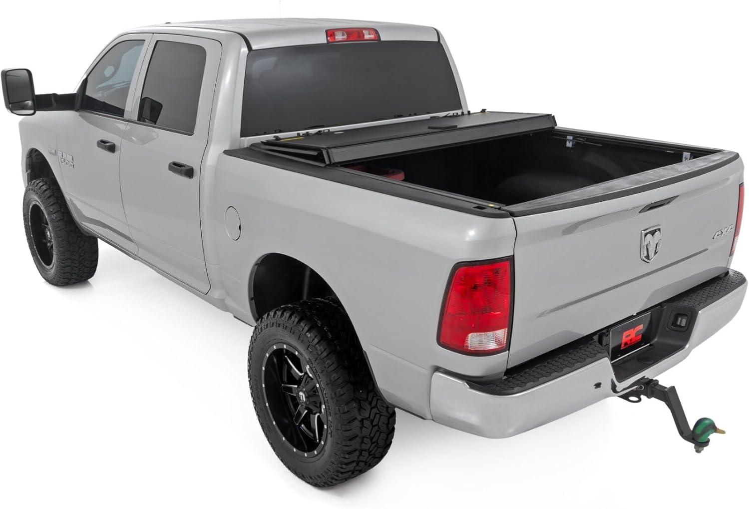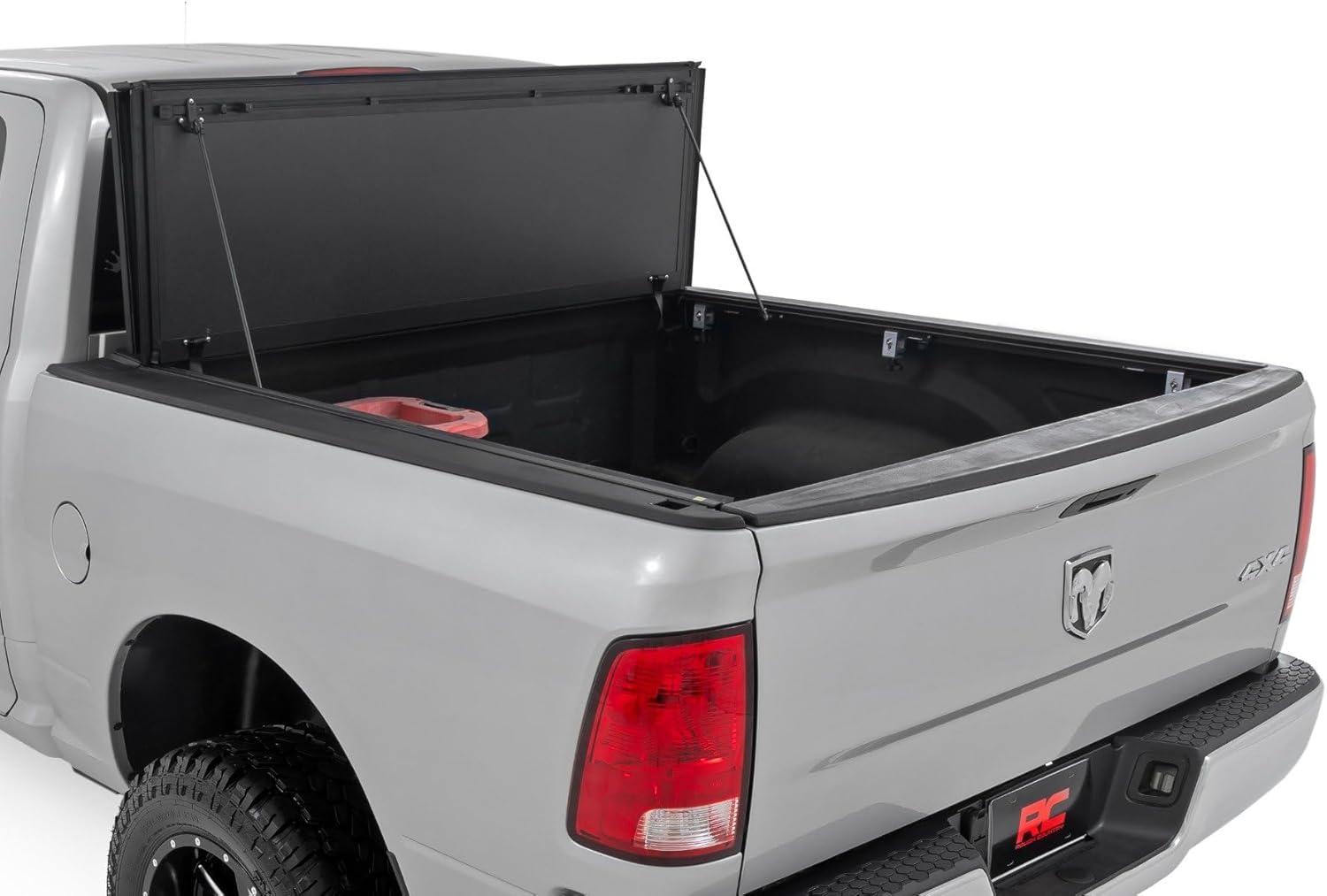 Elevate your Ram's truck bed and get full access, unmatched durability, and superior weather protection with Rough Country's Hard Tri-fold Flip-up Bed Cover!
