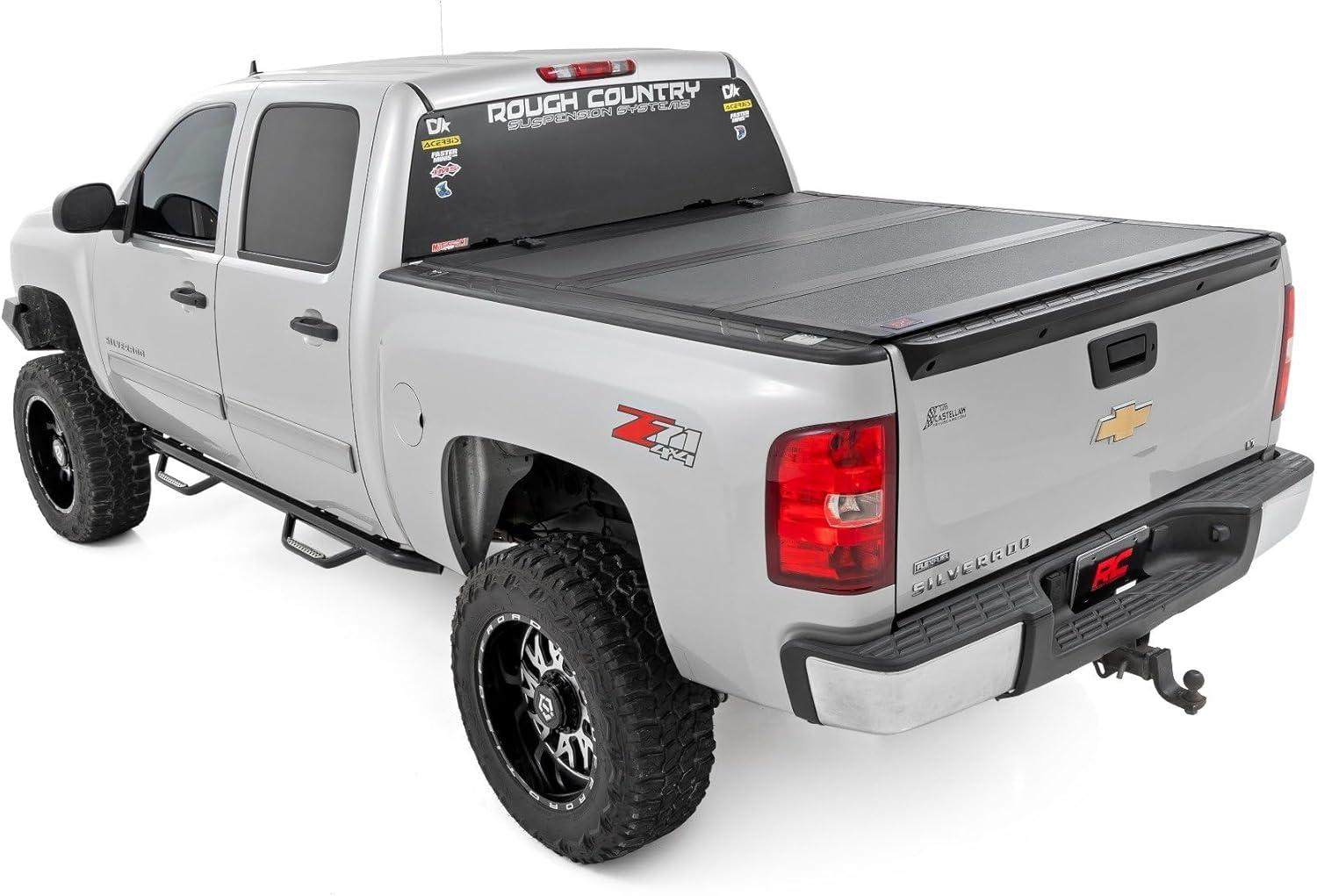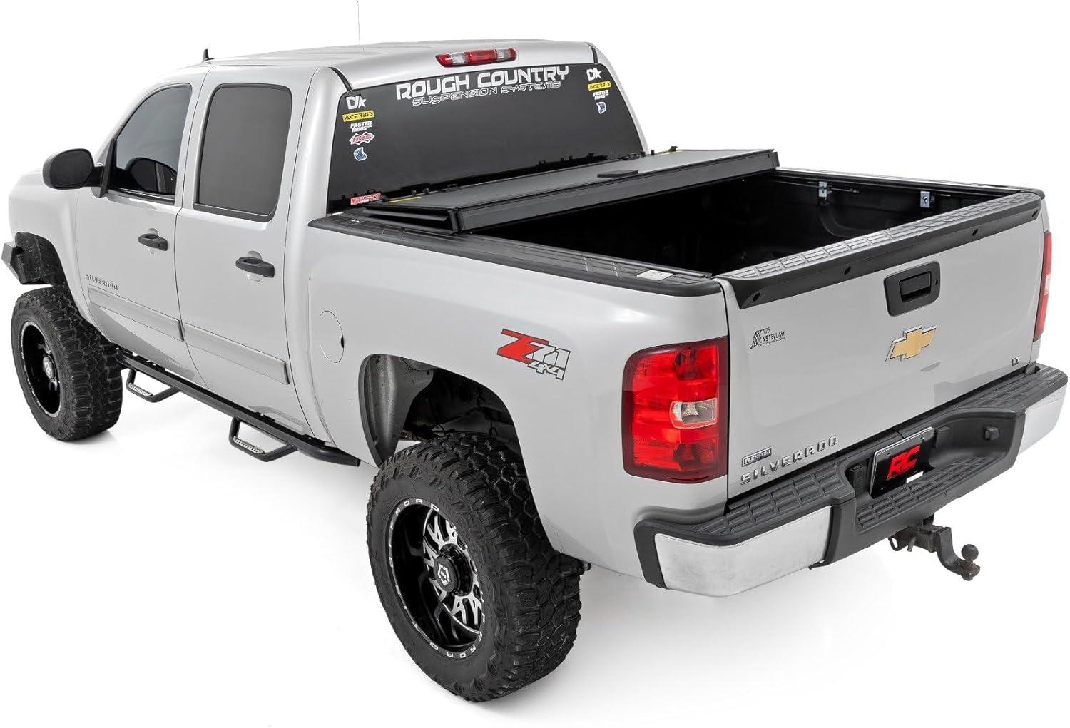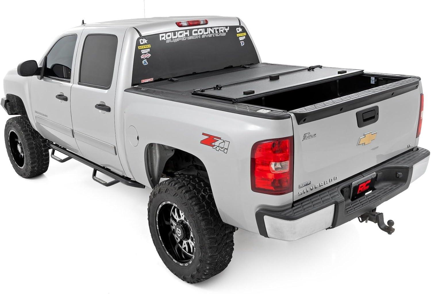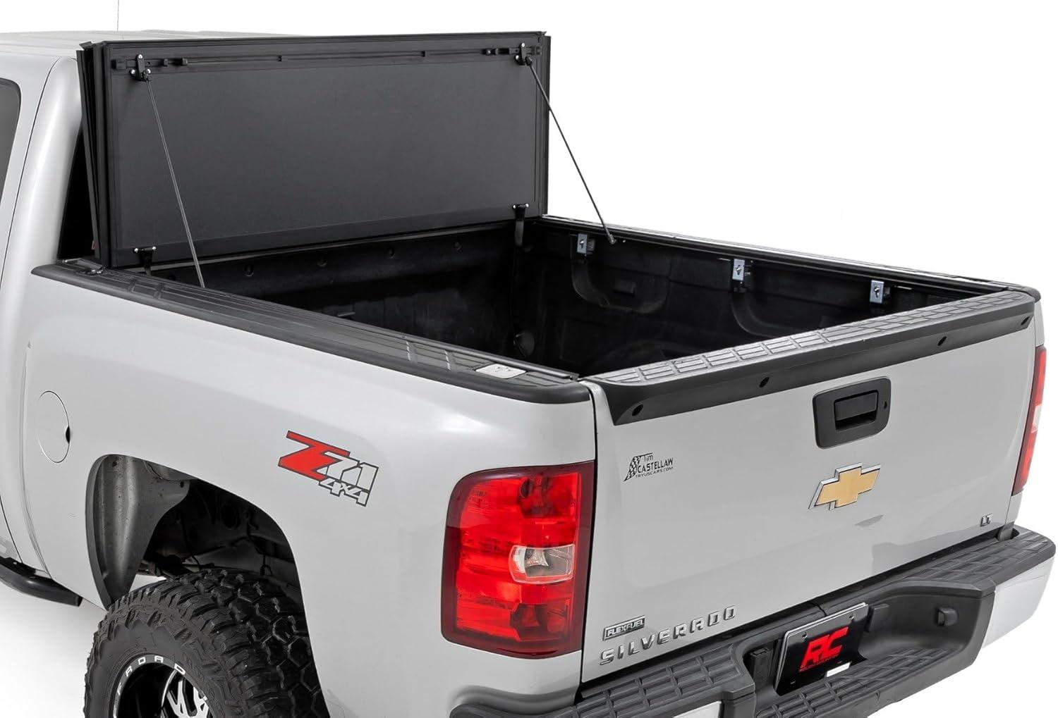 Elevate your Chevy/GMC's truck bed and get full access, unmatched durability, and superior weather protection with Rough Country's Hard Tri-fold Flip-up Bed Cover!