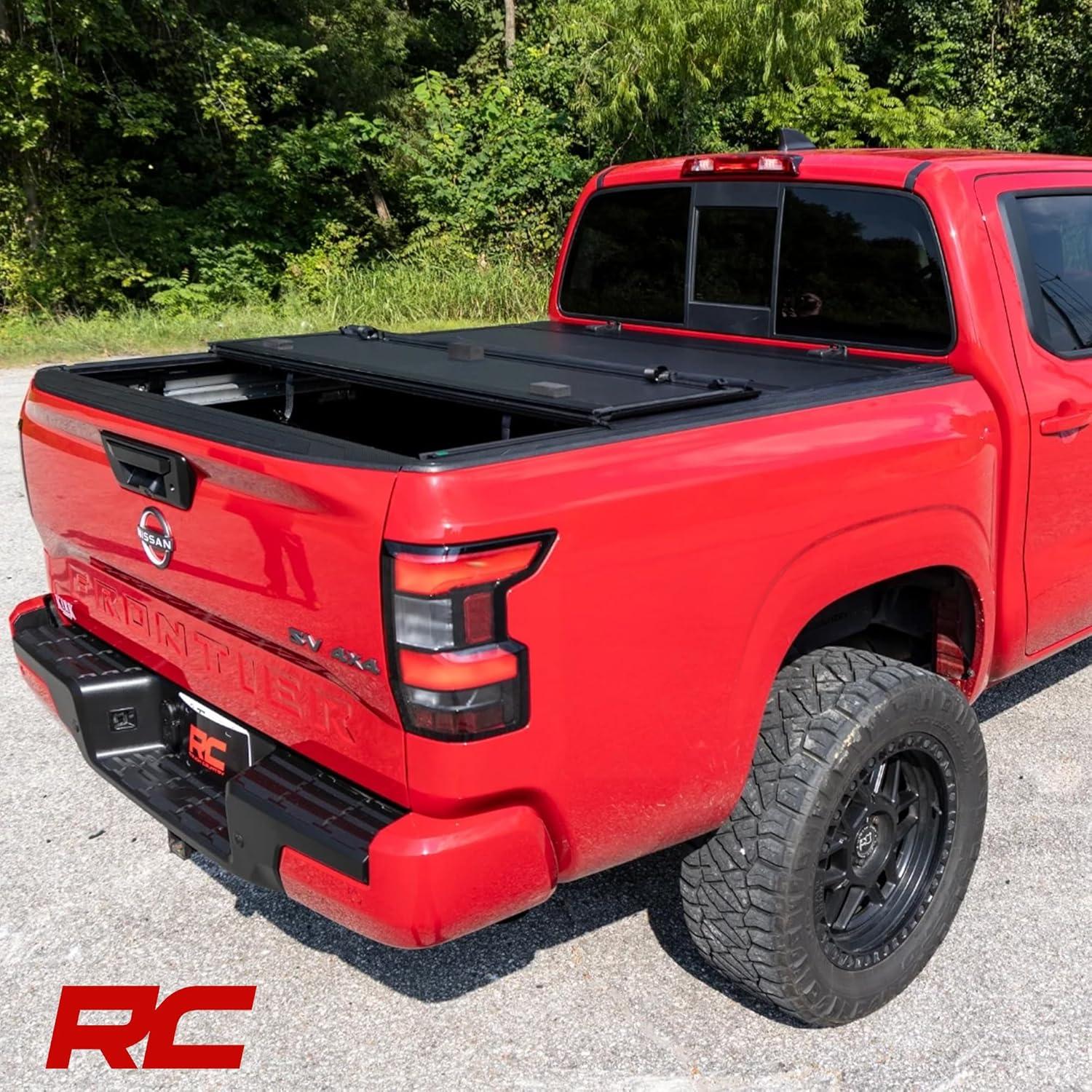 Rough Country Hard Tri-Fold Flip Up Truck Bed Tonneau Cover for Nissan Frontier (2022-2025) - Fits 5' (58.9-59.5") Bed, All-Weather, Flush Aluminum Panels