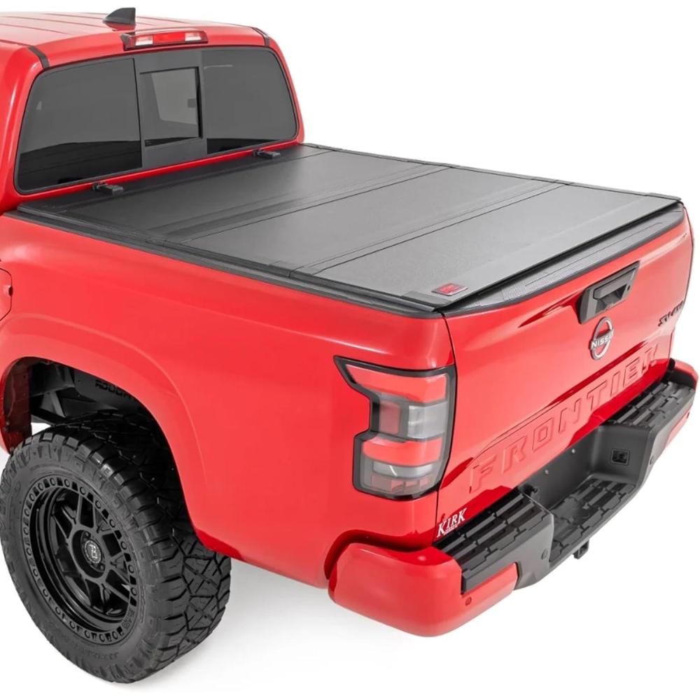 Elevate your Frontier's bed and get full access, unmatched durability, and superior weather protection with Rough Country's Hard Tri-fold Flip-up Bed Cover!