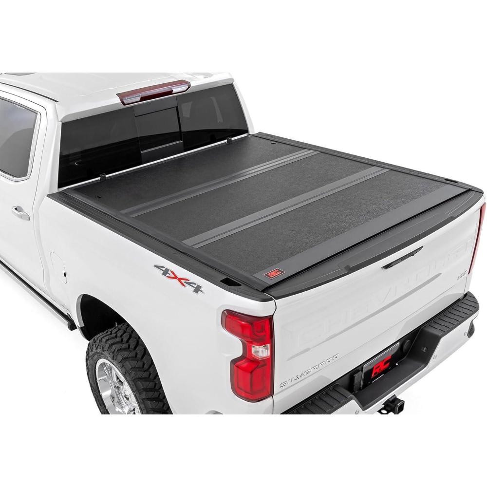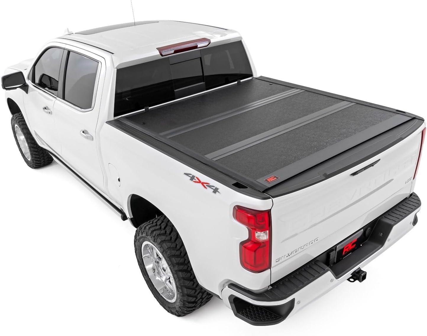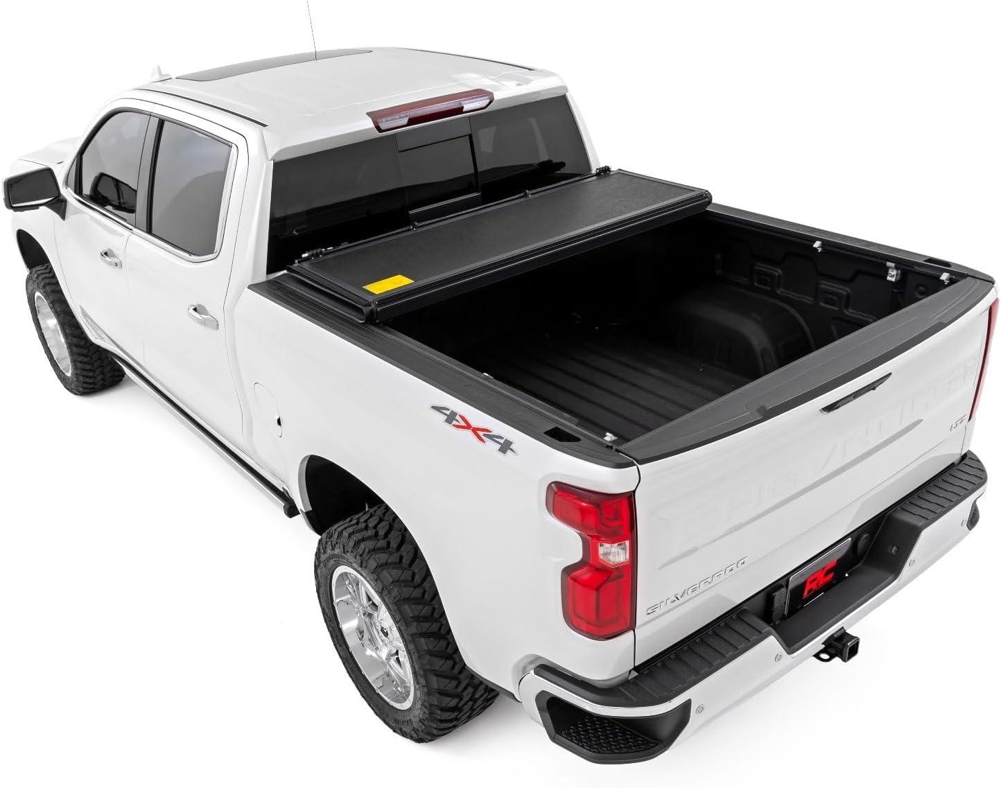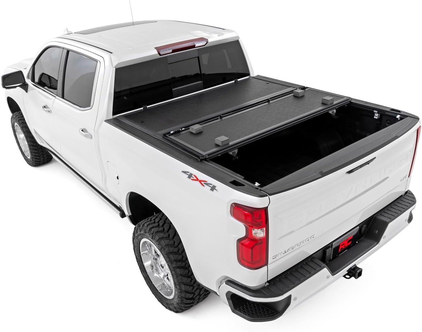 Rough Country Hard Tri-Fold Tonneau Cover for Chevy Silverado & GMC Sierra 1500/2500HD/3500HD (2014-2019) - Low-Profile Aluminum Truck Bed Cover, Fits 5'9 Bed w/Rail Caps