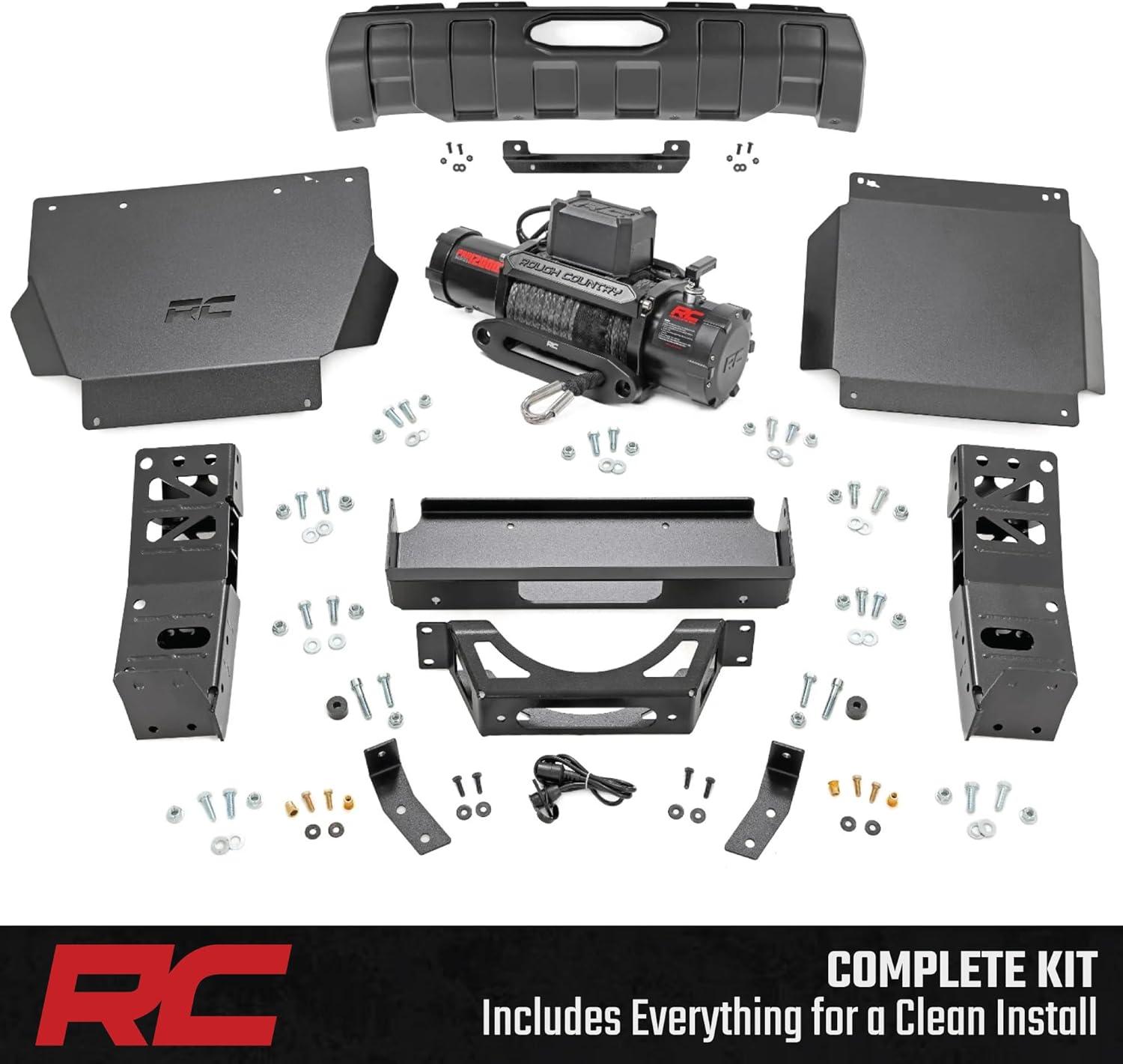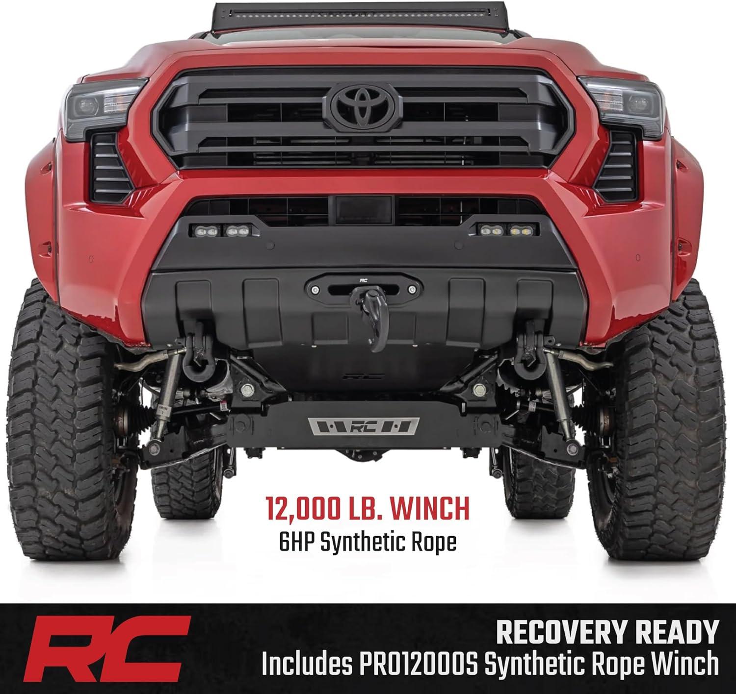 Built for Recovery Power: Features Rough Country’s ProSeries 12,000 LB Synthetic Rope Winch for powerful, reliable recovery in a sleek, integrated design – giving your Tacoma confidence on any terrain.