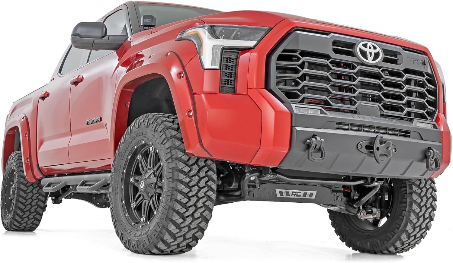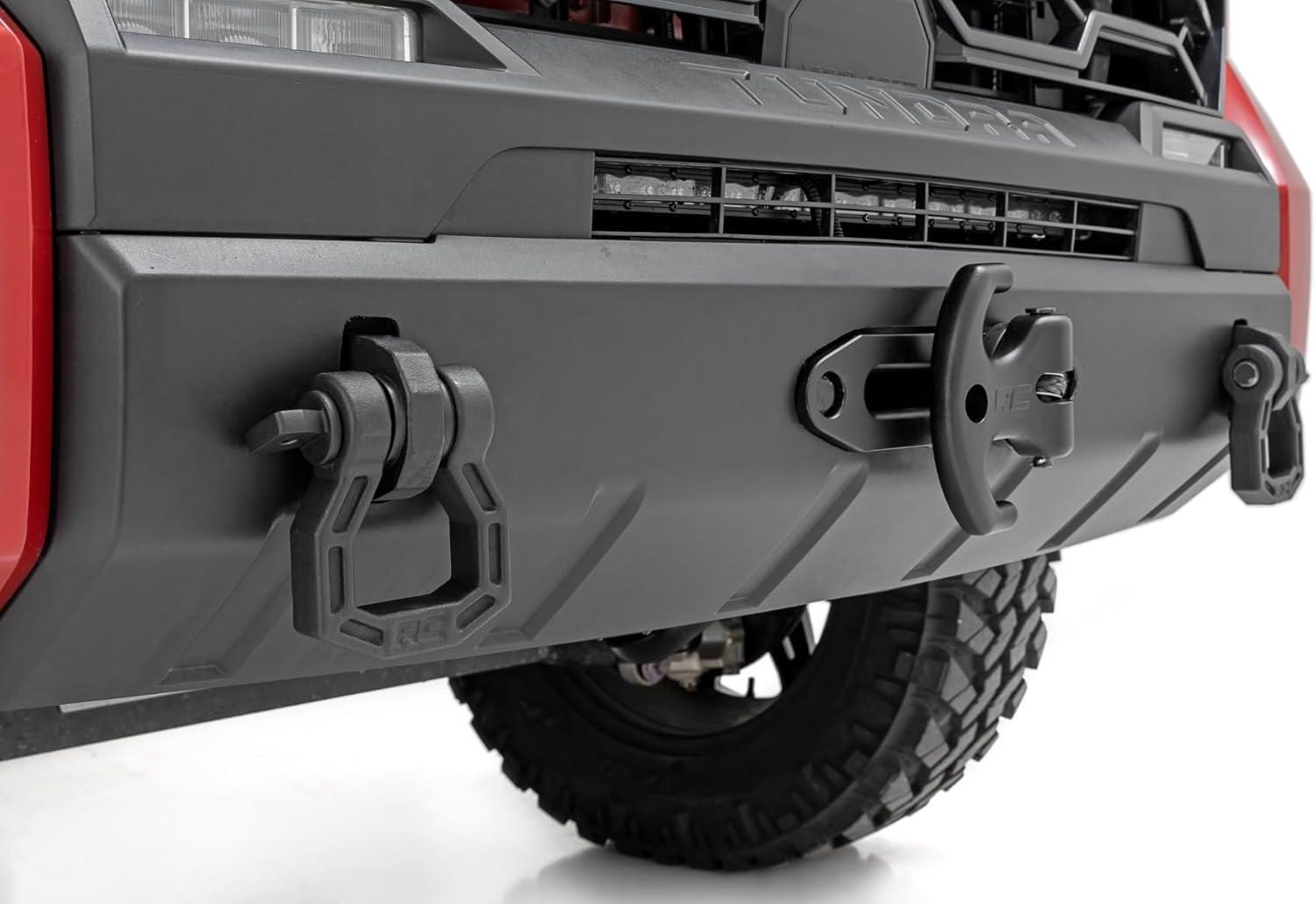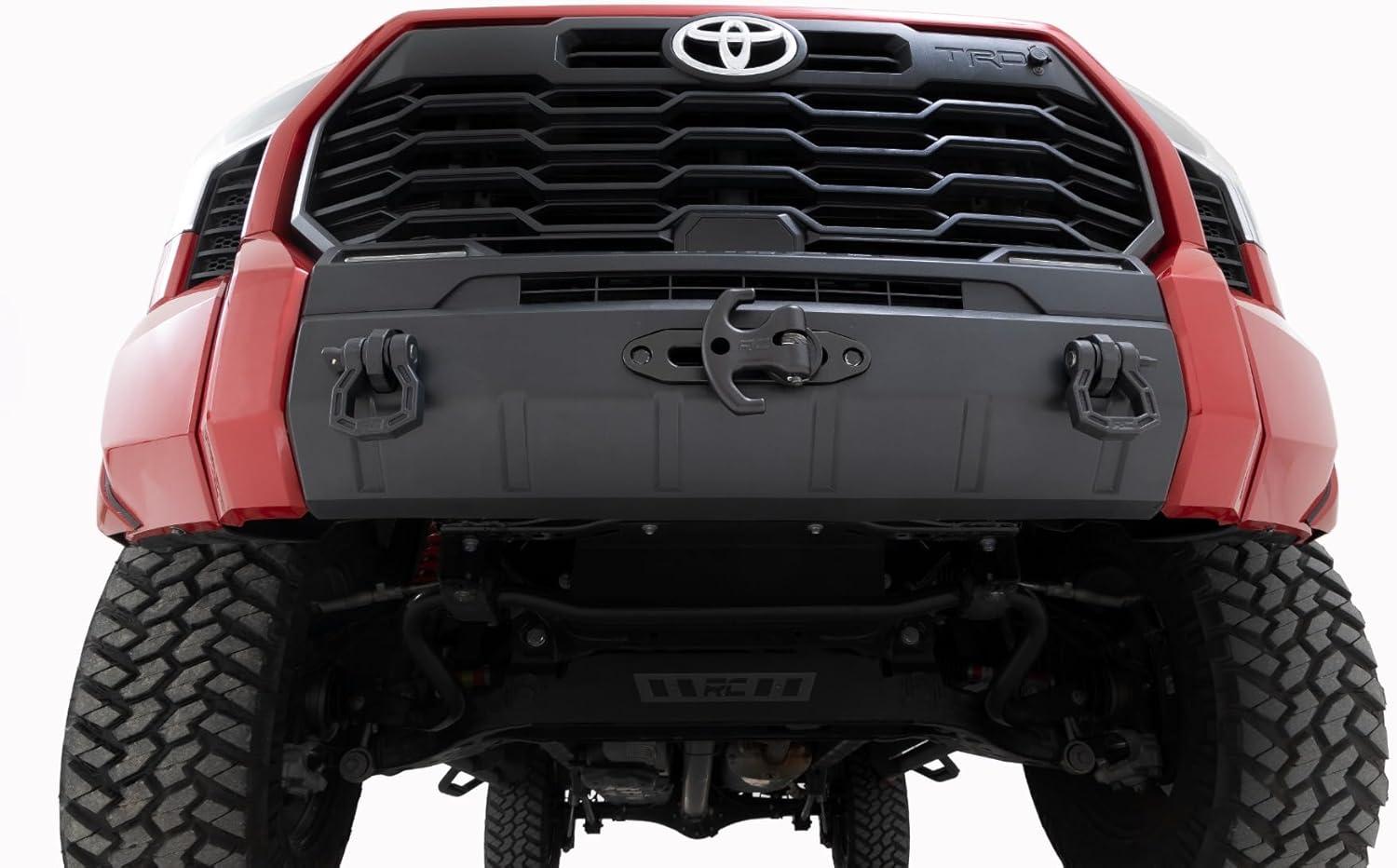 Improve Your Recovery Power. Upgrade your Toyota Tundra with Rough Country's Hidden Winch Mount! This stylish solution is the perfect way to equip your vehicle with a reliable recovery system without sacrificing its sleek appearance. The modular, 6-piece design is designed specifically to fit Rough Country's 12,000lb or 9500lb winch. The winch is strategically placed behind the factory bumper cover, making it a hidden powerhouse ready to tackle any obstacle that comes your way. Premium Quality and Style. Constructed from rigid 7-gauge material, this mount replaces your factory's inner bumper structure to provide maximum durability and strength. The optional D-ring mounts offer even more versatility for recovery situations and come with D-ring mount spacer plates. And for added convenience, this Hidden Winch Mount includes a remote harness connector for easy winch operation. Installation. Installation is a breeze with an easy bolt-on application and minor trimming for fairlead and D-ring mounts. Remove your front bumper cover and follow the included instructions for a seamless install. And, this Hidden Winch Mount is also compatible with Rough Country's 20-in Slim Line Bumper LED, making it the perfect addition to your Tundra's already rugged appearance. Warranty. Rough Country backs our Hidden Winch Mount with a limited lifetime replacement warranty. As such, this is protected from structural and workmanship damage after the date of purchase. Our industry-leading warranty gives you peace of mind when using Rough Country products!
