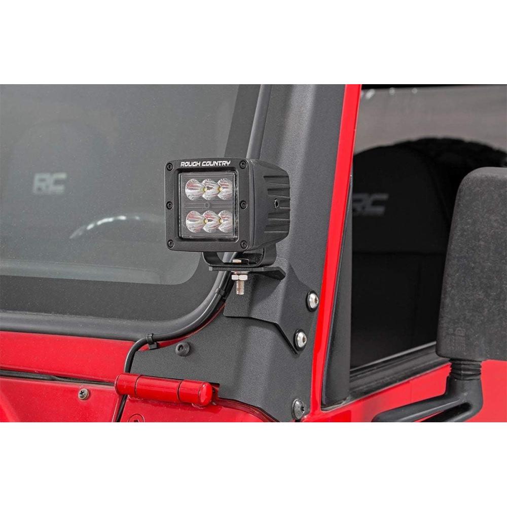Rough Country's A-Pillar 2″ LED Cube Mounts offer the perfect position for adding extra LED illumination to the front of your Jeep TJ. This classic-looking setup allows you to mount a Rough Country 2″ LED Cube or any standard-sized LED light to the a-pillar of your Jeep, giving you a commanding presence and military Jeep feel! Rough Country's A-Pillar Mount is designed to be modular, and works perfectly with our 2″ Lower Windshield Mount for a doubled-up look, and it can be mounted directly on top of our 50in Upper Windshield Mount for an onslaught of forward facing illumination! These durable mounting brackets are easy to install and ready to withstand the elements. Rough Country's A-Pillar 2″ LED Cube Mounts fits any aftermarket lights with a 5/16″ or 8mm post, and includes Rough Country's Lifetime Replacement Guarantee!