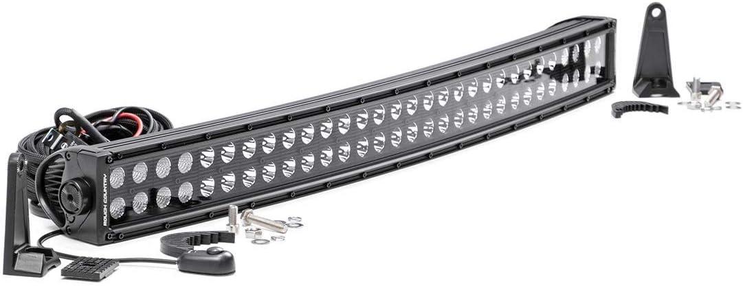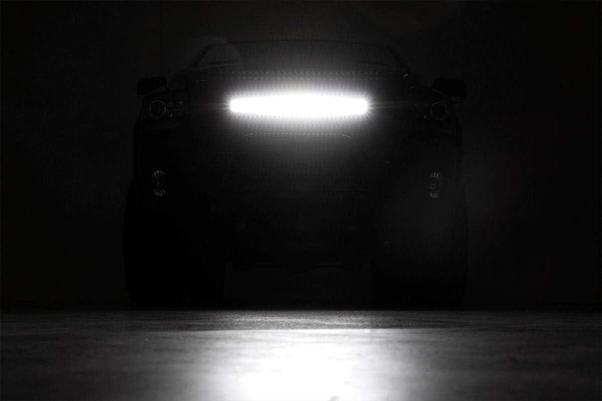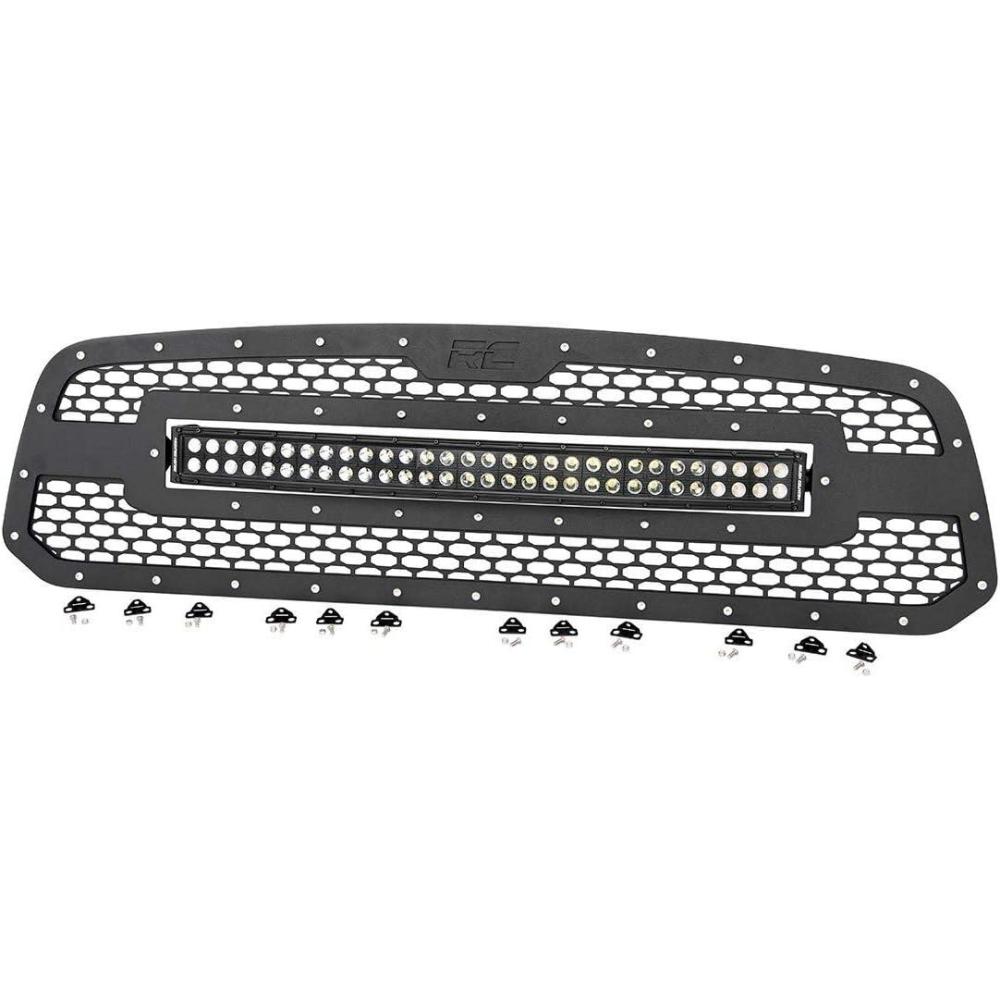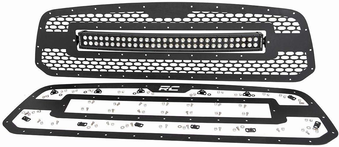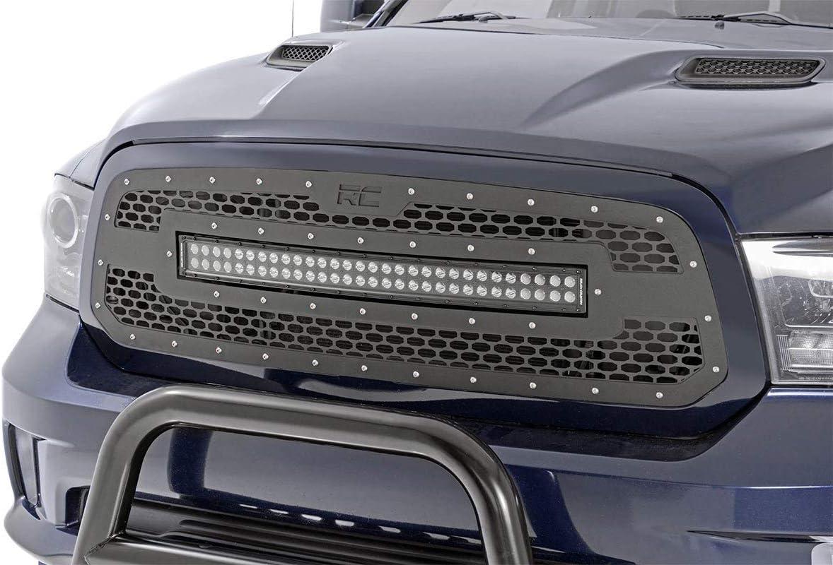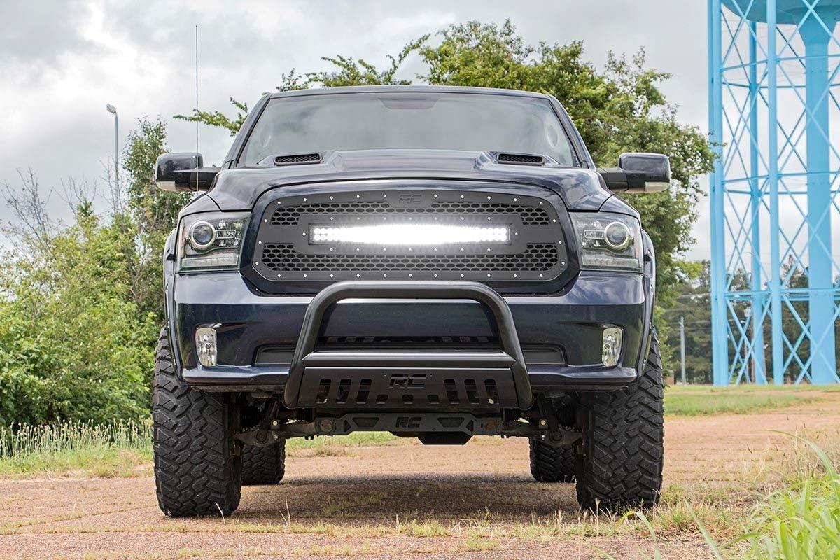 Give the front-end of your RAM 1500 a unique look with Rough Country's Mesh Grille kit. This grille replacement kit swaps out your stock grille with the eye-catching, head-turning good looks of this aftermarket upgrade. With a unique, laser-cut mesh pattern surrounded by stylish, stainless steel button-head bolts, this grill gives your truck a more menacing look that's sure to draw attention. Each kit is powder coated black to resist corrosion and give a long lifespan of good looks. This kit features a Rough Country's 30in Curved Dual-Row Black-Series LED light bar with Cree LED's outputting a staggering 14,400 Lumens and 180 Watts of lighting power. Includes a mountable on/off switch and wiring harness. Rough Country's Lifetime Replacement Warranty | 3 Years on Light Bar!