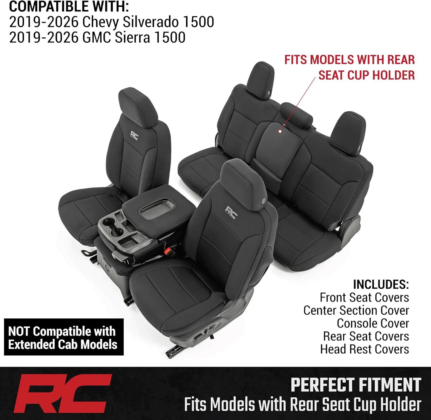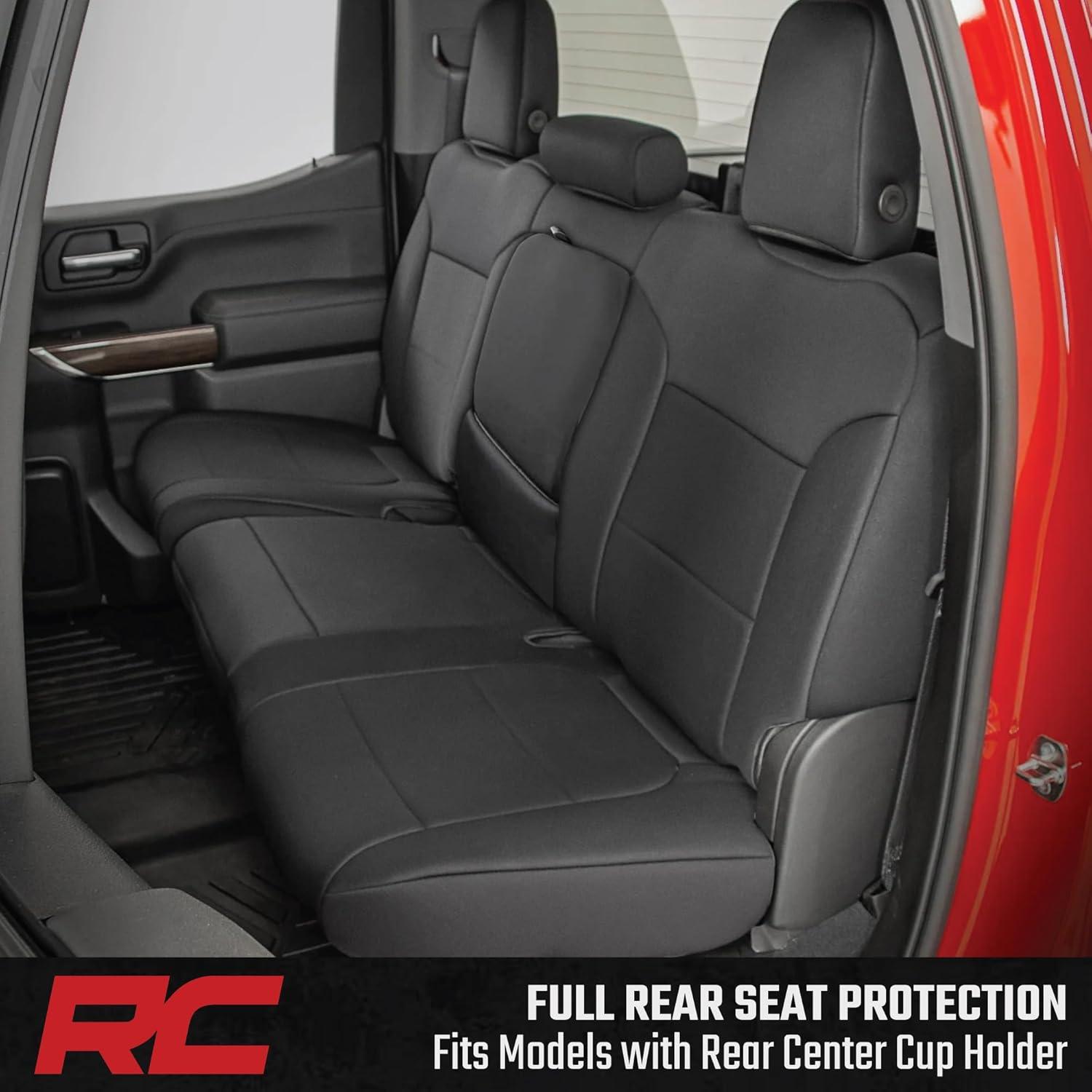 Rough Country Neoprene Seat Covers for Chevy Silverado/GMC Sierra 1500 (2019–2026) w/Rear Cup Holder – Waterproof, UV-Resistant, Foam Padded, Front & Rear Row Cover Set(Covers)