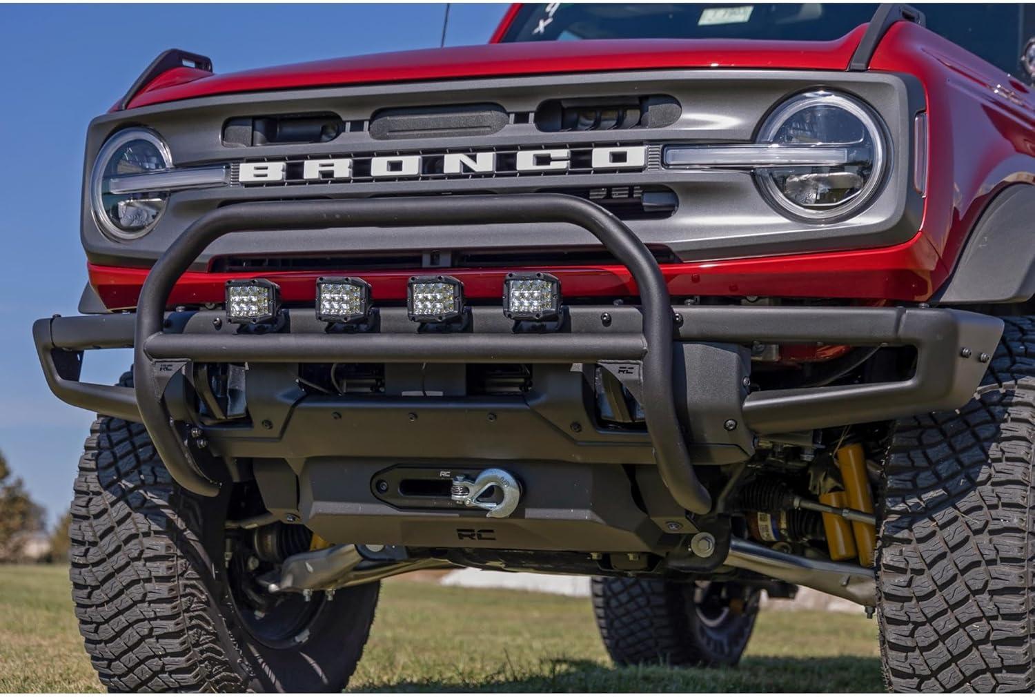 Innotative Design. Outfit your Ford Bronco right with Rough Country's Nudge Bar. This durable 2-inch thick tubular steel bull bar provides unbeatable protection for the front side of your vehicle all while offering multiple LED mounting solutions to provide ample lighting for the trail ahead. Durable Upgrade. Each Nudge Bar is coated with a corrosion-resistant black powder coat to ensure a long lifespan for years to come. Rough Country's Nudge Bar can be equipped with four round LED lights, or a single row 20″ LED light bar! Rough Country’s all-weather LED lights feature a durable, die-cast aluminum housing and include a premium, waterproof, flat-wound, braided wiring harness with a toggle switch and in-line fuse. Installation & Warranty. Featuring a 100% bolt-on installation process an estimated timeframe of 3-4 hours is predicted to complete the installation process. This full kit can be installed and can be completed efficiently and quickly! Rough Country's Nudge Bar is backed with a limited lifetime replacement warranty towards manufacturer defects. As such, the product is protected from structural and workmanship damage after the date of purchase. With our industry-leading warranty give yourself peace of mind when using Rough Country's Suspension products!