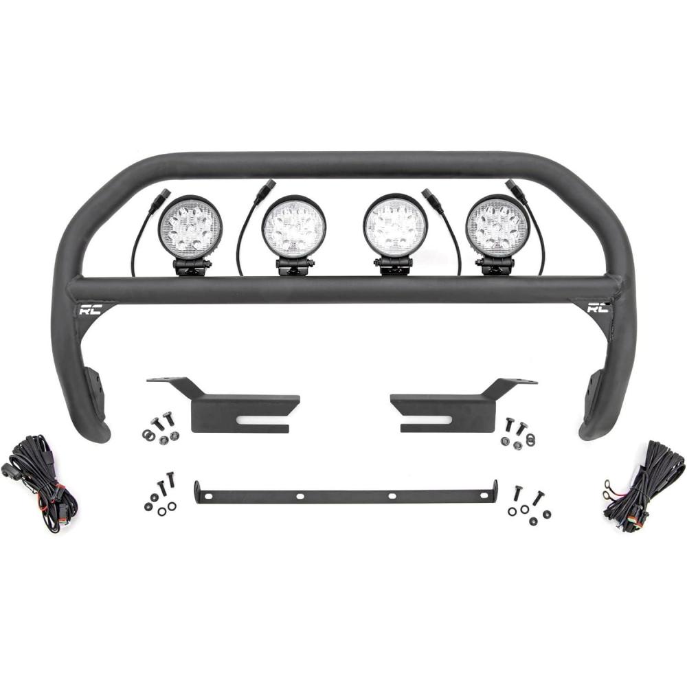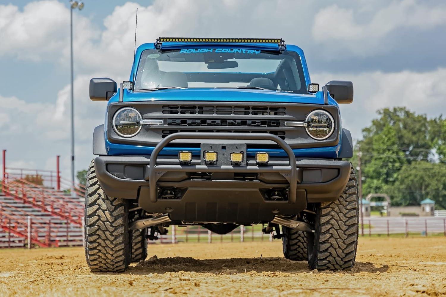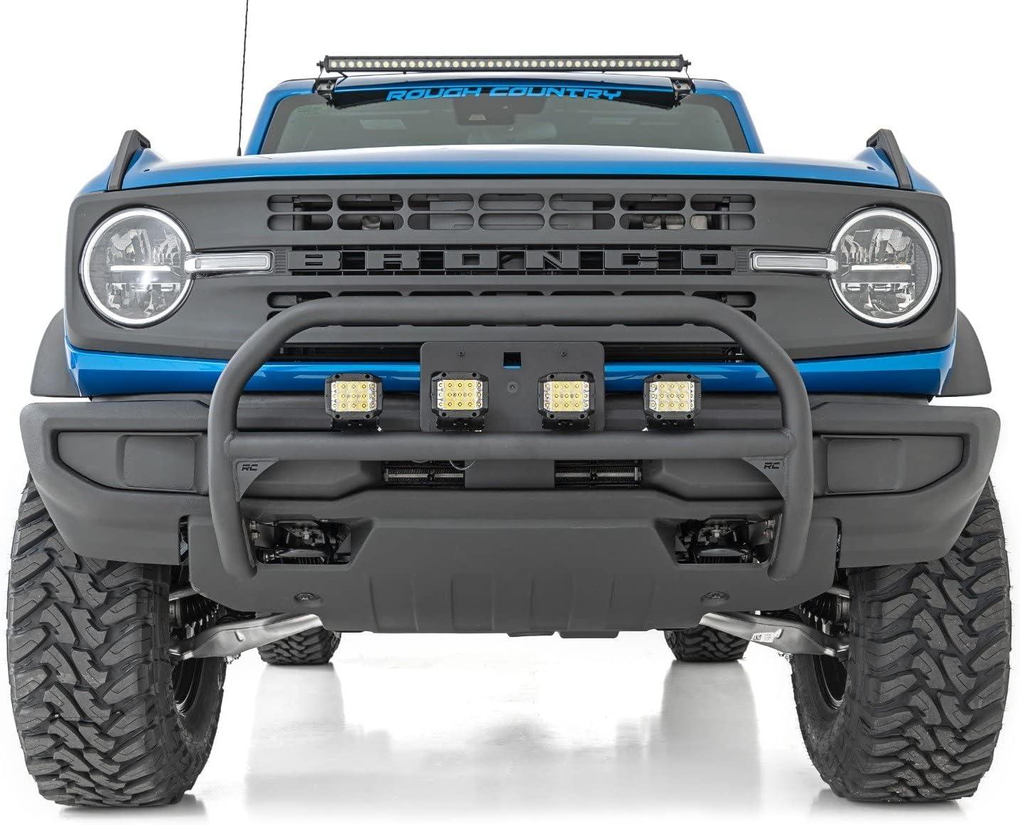 Outfit your 2021 Bronco right with Rough Country's Nudge bar. This durable 3-inch thick tubular steel bull bar provides unbeatable protection for the front side of your vehicle all while offering multipe LED mounting solutions to provide ample lighting for the trail ahead. This easy-to-install bull bar features a 100% bolt-on installation process, giving you a simple way to add this eye-catching upgrade that provides protection from hazards on and off-road. Each Nudge Bar is coated with corrosion-resistant black powder coat to ensure a long-lifespan for years to come. This Nudge Bar includes four 4″ round LED lights with wiring harness and mounting hardware. Rough Country’s all-weather LED lights feature a durable, die-cast aluminum housing and include a premium, waterproof, flat-wound, braided wiring harness with toggle switch and in-line fuse.