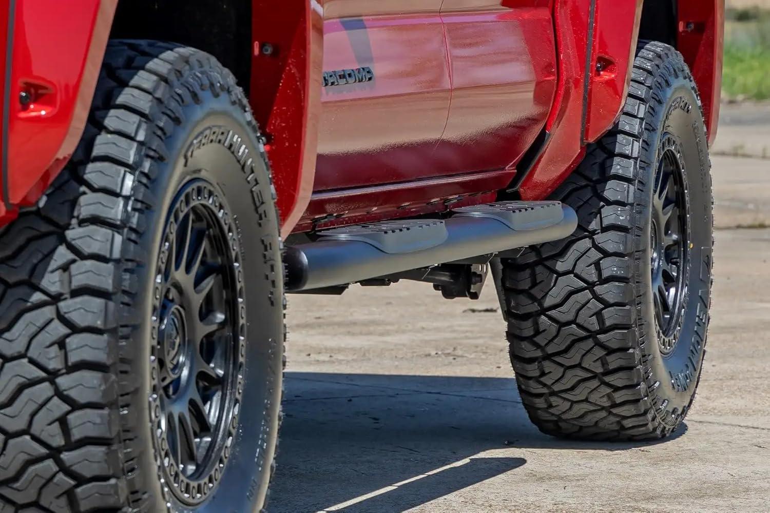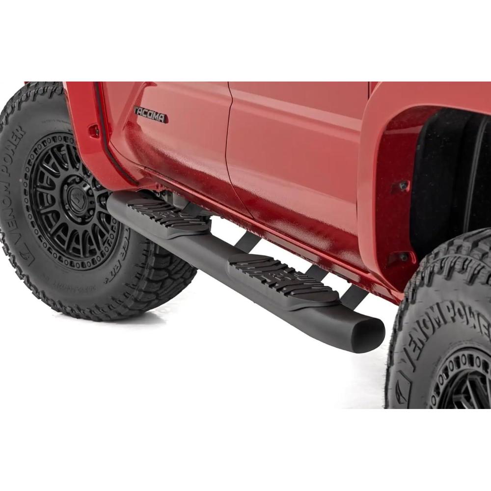 Give your Tacoma the perfect finishing touch with Rough Country's Oval Nerf Step Bars. They feature non-slip foot pads for secure footing with a classic OEM design that looks great on any Tacoma, including lifted models. These step bars are designed for both form and function with a curved and stylish look.