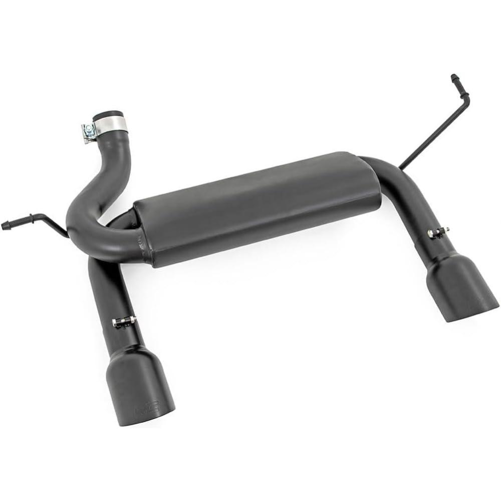 Overhaul the look and sound of your JKs exhaust with Rough Country's Dual-Outlet Performance Exhaust System. Available in polished stainless steel or matte black stainless steel finish, these durable exhaust systems offer a throaty growl and menacing appearance that fits in perfectly with the aggressive look of a modified Jeep. Each exhaust system features a 409 stainless body with high temperature resistant coating for a long lifespan of good looks. This high-quality exhaust modification features 21/2″ mandrel-bent tubing that's designed for a high-flow, guttural sound that every driver will enjoy. A set of dual-wall exhaust tips with embossed RC logo add a finishing touch to this great-looking upgrade, constructed from corrosion resistant 304 black stainless material. Rough Country's Dual-Outlet Performance Exhaust System is easy to install with no cutting or welding required!