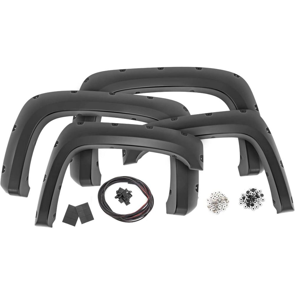 Add aggressive good looks quickly and easily with Rough Country's Pocket Fender Flares. Nothing compliments a new lift, wheels, and tires like a set of stylish, mean-looking fender flares. Rough Country's Fender Flares are designed with a simulated riveted look. These fender accessories bolt-on quickly and easily in a few secure mounting points, making installation a cinch. No cutting or drilling is required to install, and these flares can be easily removed and return your truck to stock! These UV treated fender flares ship in flat-black or can easily be painted to match your vehicle, and are designed to withstand the sun, rain and other elements of nature. Rough Country Fender Flares are guaranteed to be free of defects for 3 years!