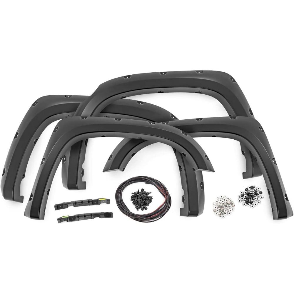 Add aggressive good looks quickly and easily with Rough Country's Fender Flares. Nothing compliments a new lift, wheels, and tires like a set of stylish, mean-looking fender flares. Rough Country's Fender Flares are designed with a simulated riveted look. These fender accessories bolt-on quickly and easily in a few secure mounting points, making installation a cinch. No cutting or drilling is required to install, and these flares can be easily removed and return your truck to stock! These UV treated fender flares ship in flat-black or can easily be painted to match your vehicle, and are designed to withstand the sun, rain and other elements of nature. Rough Country Fender Flares are guaranteed to be free of defects for 3 years!