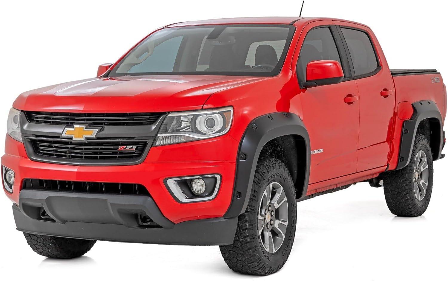 No cutting or drilling is required to install, and these flares can be easily removed and return your truck to stock! These UV treated fender flares ship in flat-black or can easily be painted to match your vehicle, and are designed to withstand the sun, rain and other elements of nature. Rough Country Fender Flares are guaranteed to be free of defects for 3 years! Note: compatible only with 2015-2022 2WD/4WD Chevrolet Colorado models with a 5' bed, will not fit ZR2 package. Tire Coverage: 2 inches, Flare Height: 5.5 inches.