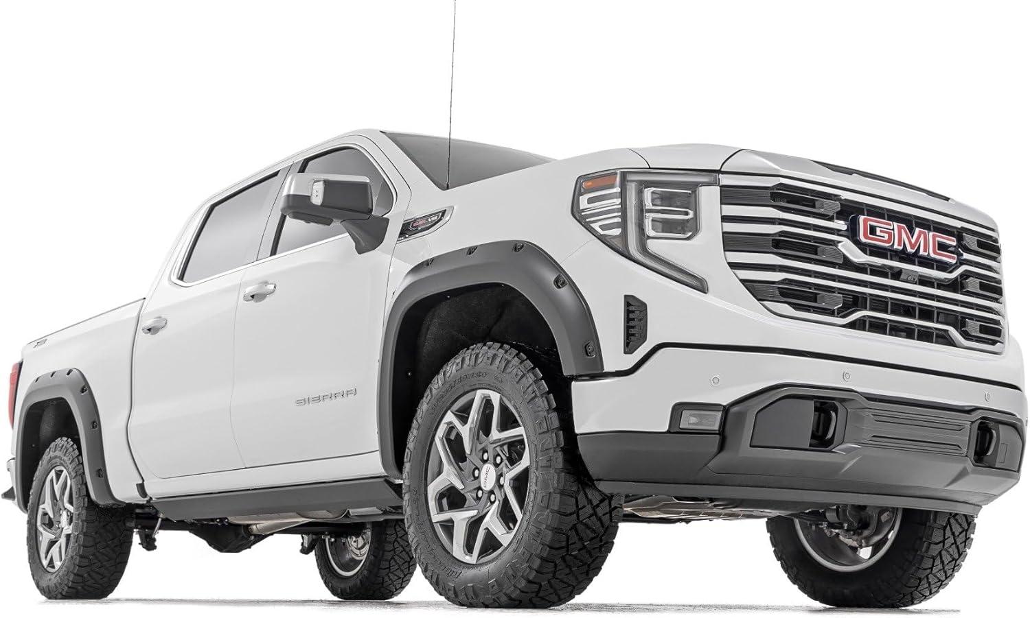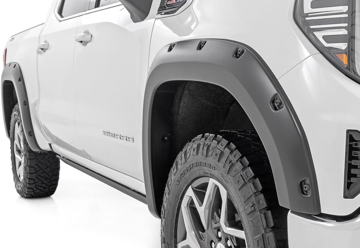 Off-Road Style: Give your Sierra truck a rugged, commanding look with our pocket fender flares featuring a simulated riveted design, ready for easy paint customization.