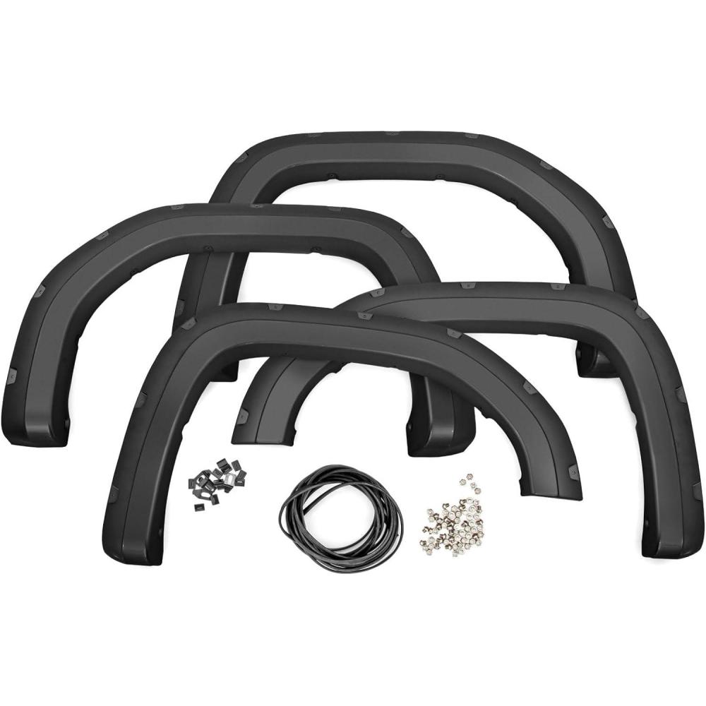 Add aggressive good looks quickly and easily with Rough Country's Fender Flares. Nothing compliments a new lift, wheels, and tires like a set of stylish, mean-looking fender flares. Rough Country's Fender Flares are designed with a simulated riveted look. These fender accessories bolt-on quickly and easily in a few secure mounting points, making installation a cinch. No cutting or drilling is required to install, and these flares can be easily removed and return your truck to stock!