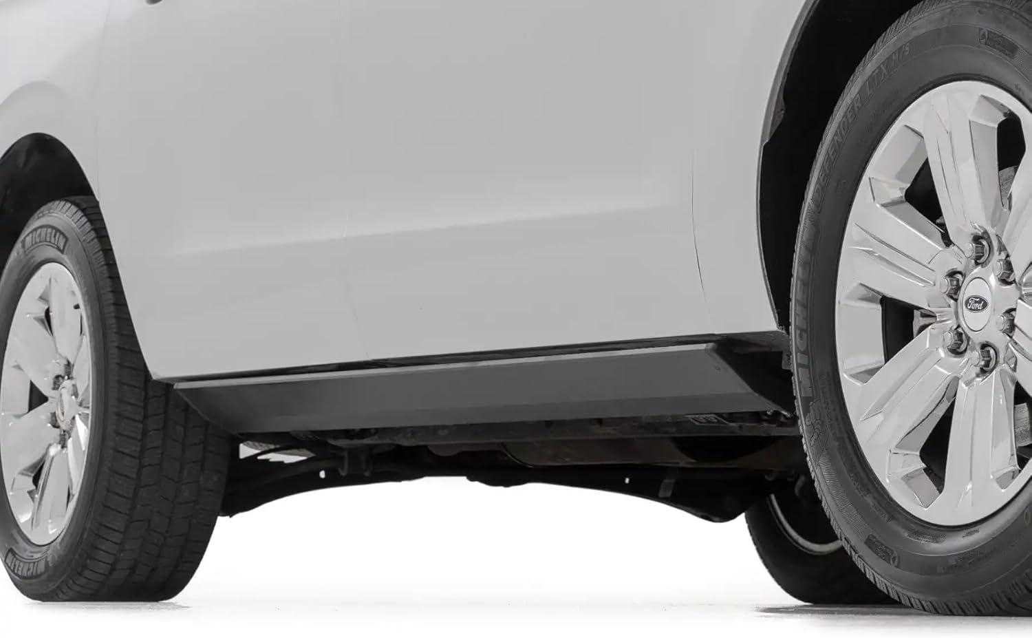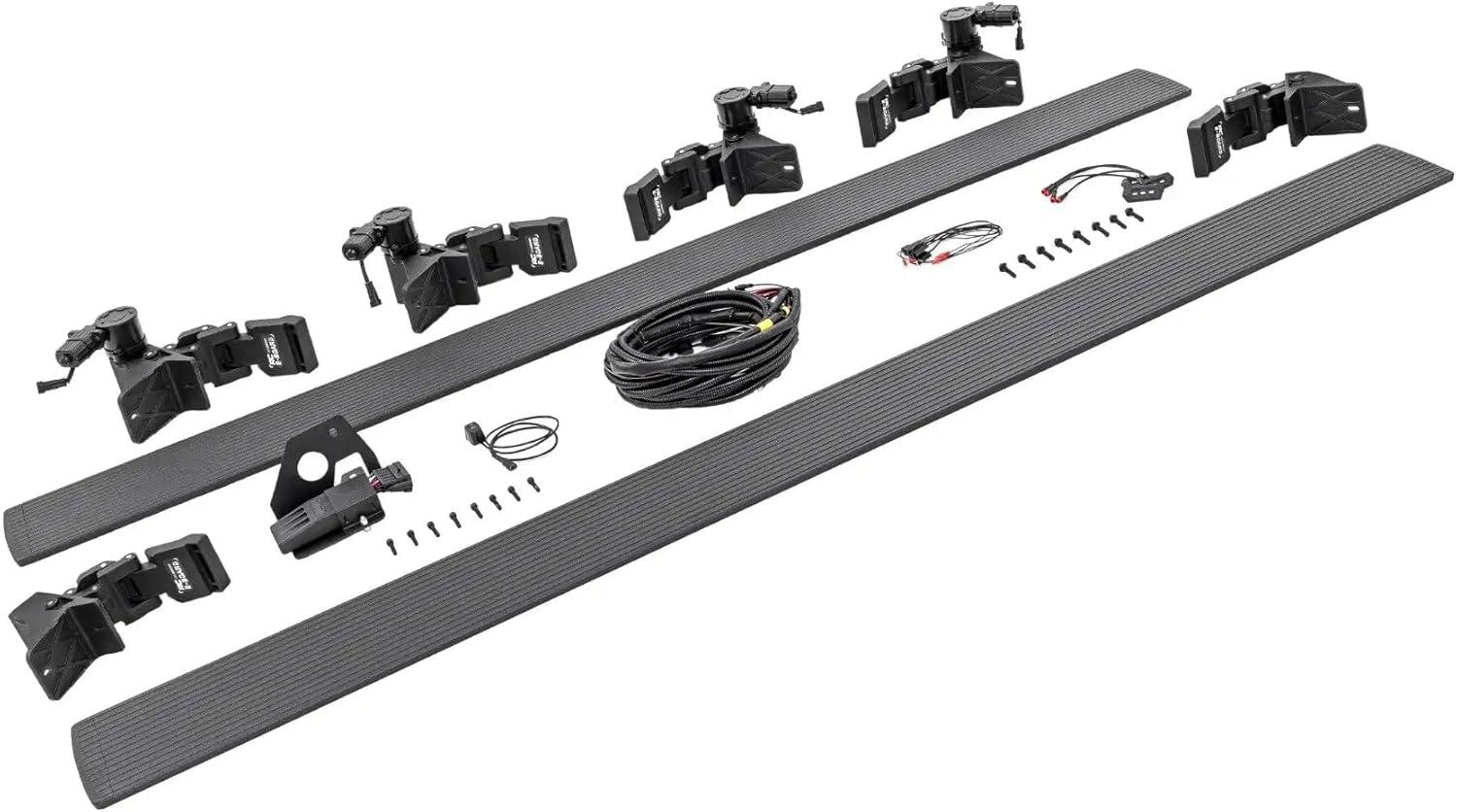 Premium Construction. The Rough Country E-Board Steps combine durability, strength, and style. These 6″ all-season steps are made from lightweight yet durable aluminum and can support up to 660 lbs per side. Equipped with dual motor technology, these steps can handle anything Mother Nature throws their way. They feature an automatic 'SAFE-STOP' mechanism that engages if a blockage is detected and include an interior bypass switch for manual override. So whether you're heading out on a weekend errand or loading up for a camping trip, our electric steps offer reliable protection for all your adventures.