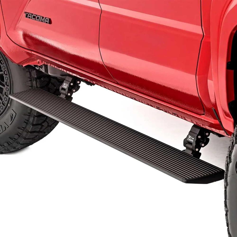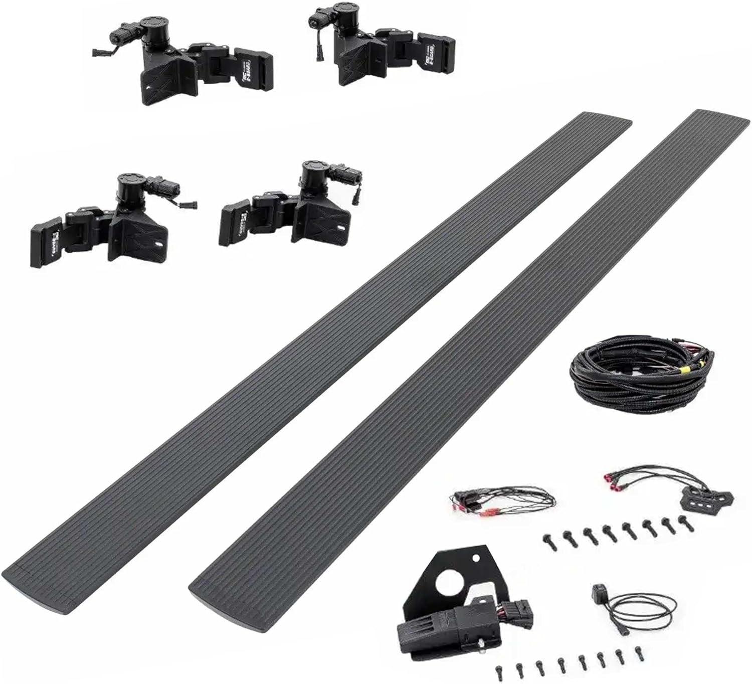 Premium Construction. The Rough Country E-Board Steps combine durability, strength, and style. These 6″ all-season steps are made from lightweight yet durable aluminum and can support up to 660 lbs per side. Equipped with dual motor technology, these steps can handle anything Mother Nature throws their way. They feature an automatic 'SAFE-STOP' mechanism that engages if a blockage is detected and include an interior bypass switch for manual override. So whether you're heading out on a weekend errand or loading up for a camping trip, our electric steps offer reliable protection for all your adventures.
