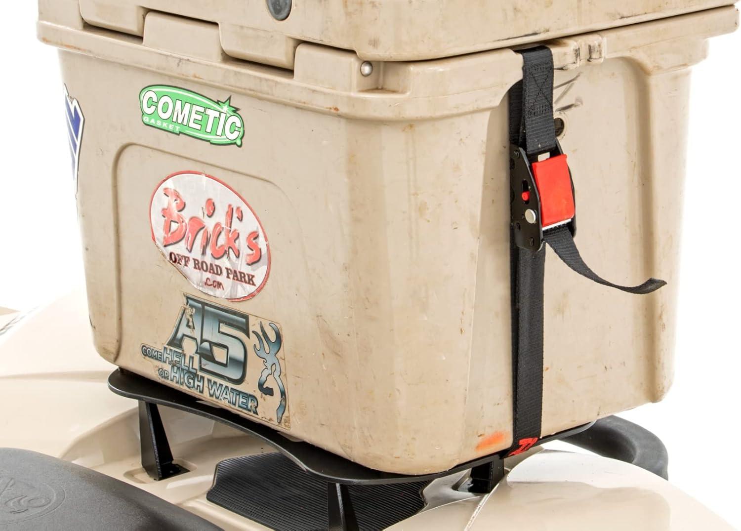 Secure your cooler to the rear of your Can-Am Renegade with Rough Country's rear cooler mount. This modern solution allows you to keep your cooler firmly in place during off-road travel. This convenient kit includes an easy mounting system and two tie down straps designed to keep your favorite roto-molded cooler in place as you traverse off-road terrain. Say goodbye to sliding, sloshing, loose coolers and tackle off-road obstacles with more peace of mind knowing your cooler is snug and secure in the back of your bed. Rough Country's rear cooler mount features two 1-inch Tie Down Straps. These handy, durable straps help you secure your cooler snugly to our mounting bracket with its easy-to-operate tightening system and quick-release mechanism. Measuring 60 inches in length, it offers plenty of lead to tie down anything you desire. The durable nylon material features a double-stitched, reinforced area for a long lifespan of use.