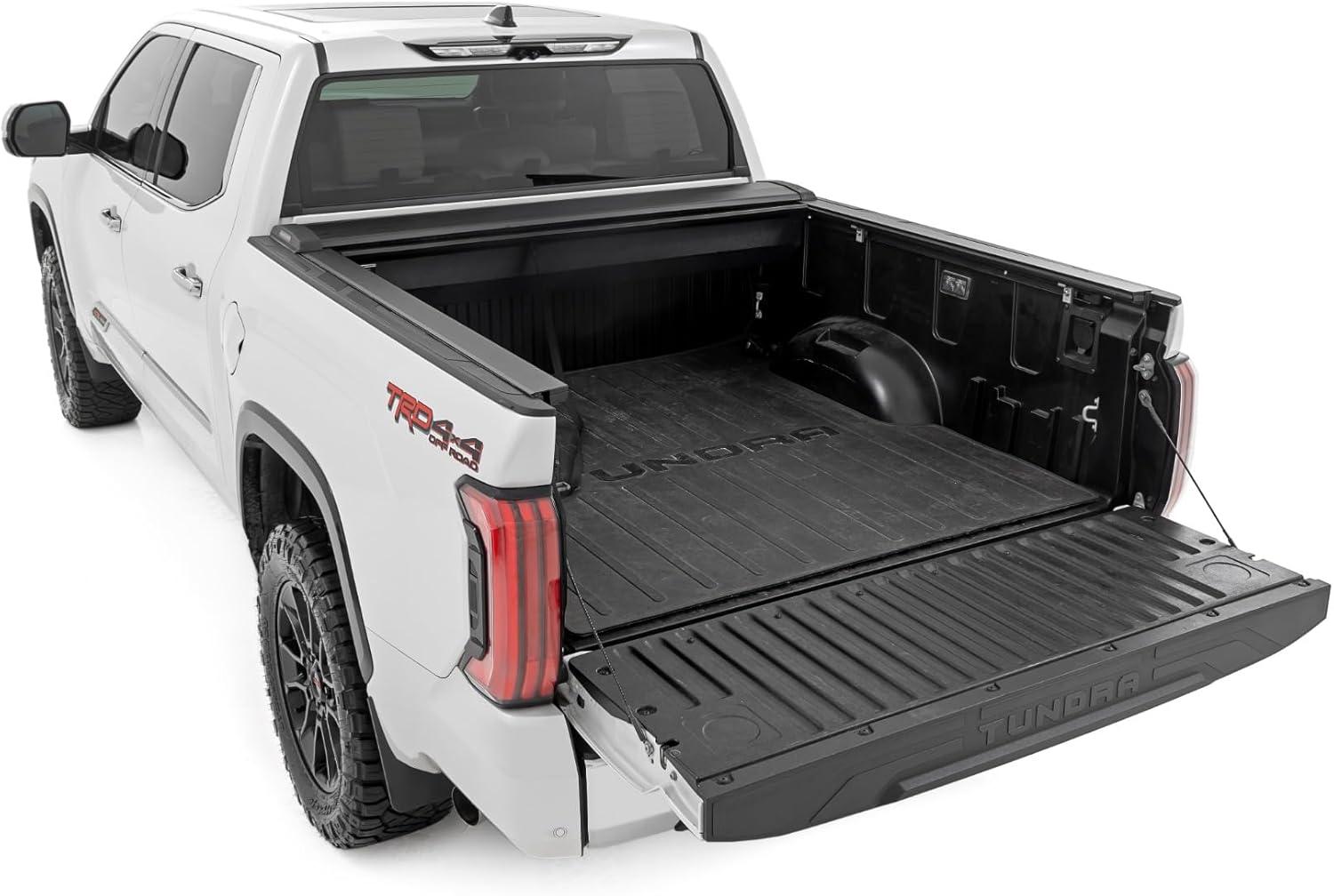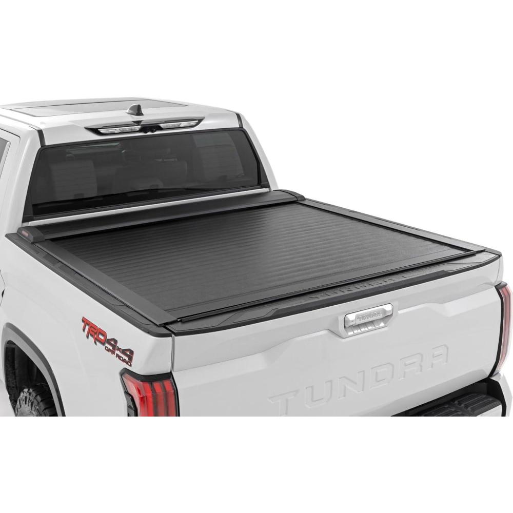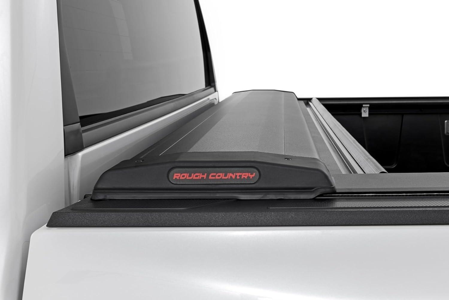 Superior Protection and Functionality. Protect your bed from weather and add security with Rough Country’s sleek Retractable Bed Covers. Boasting a weather-resistant vinyl covering over a rigid aluminum panel design Rough Country's Retractable Covers sit firmly on the bed rails allowing for full rear visibility. These durable bed covers feature a flush, low-profile design that gives your truck a clean, sleek look while protecting the contents of your bed.