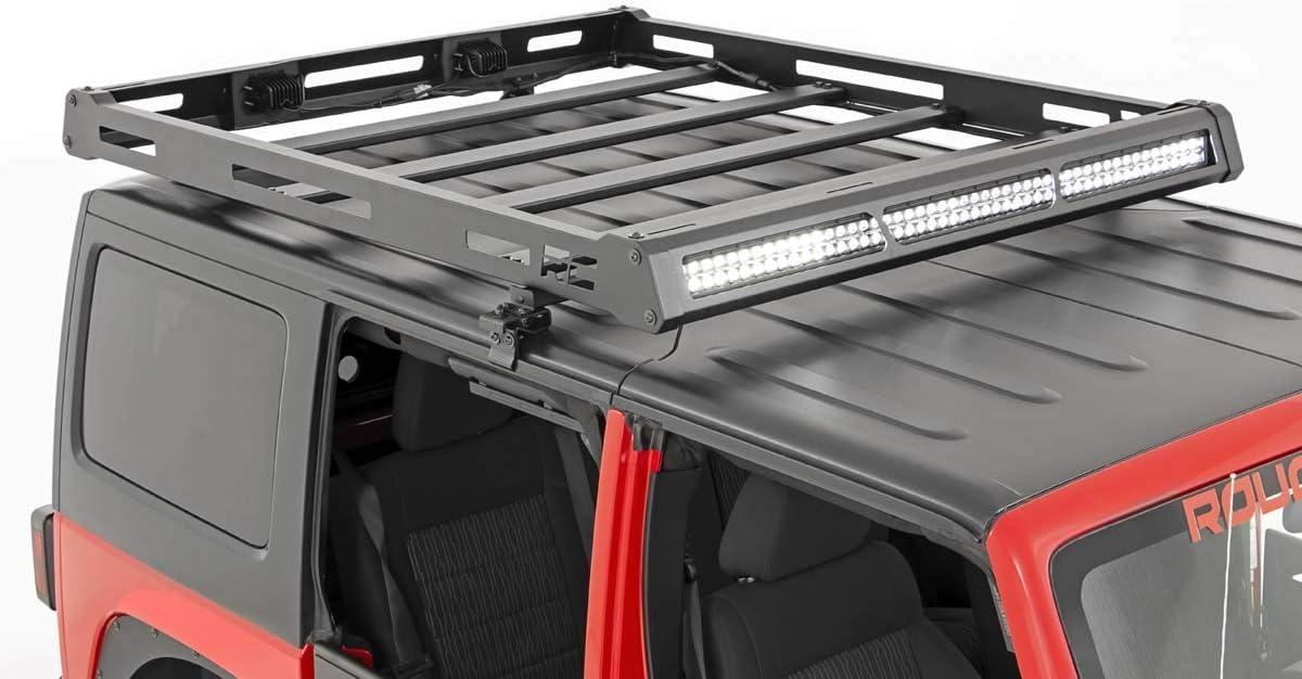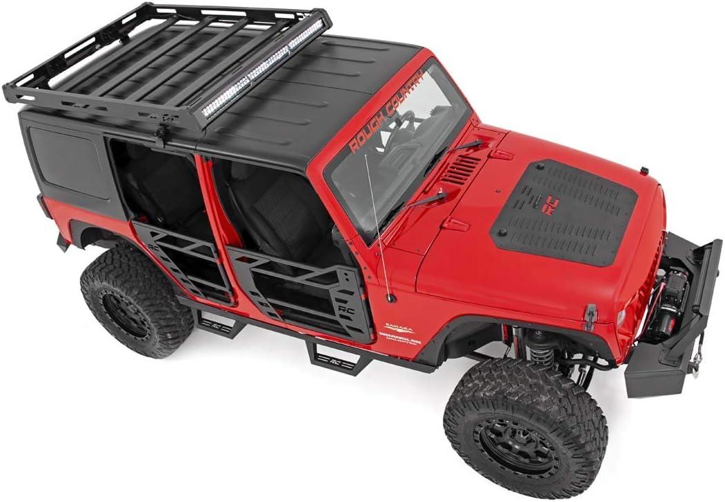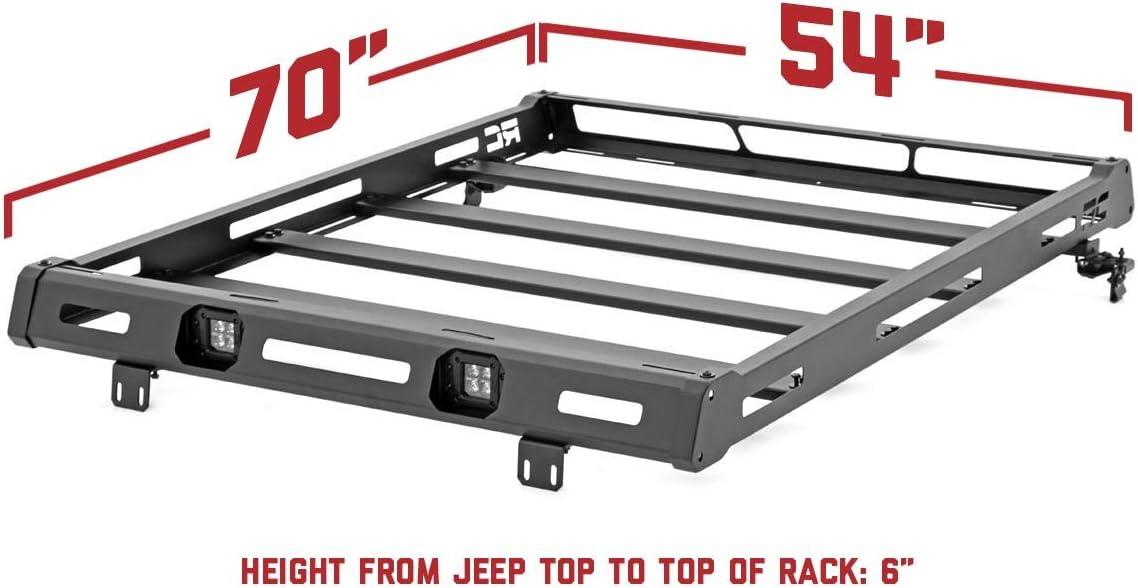 Freedom Panel Compatible & Easy to Install: Unlike bulky aftermarket racks, Rough Country's design allows full removal of the Freedom Top panels on 4-door models so you can enjoy open-air driving without removing the rack. Best of all, installation is 100% bolt-on with no drilling required.Note: Will hinder the ability to remove freedom panels on 2-Door models. Does NOT fit models equipped with Sky One-Touch Power Top. Overall Dimensions: 70″ L x 54″ W x 6″ H, Inside Dimensions: 61″ L x 50.75″ W x 3″ H.